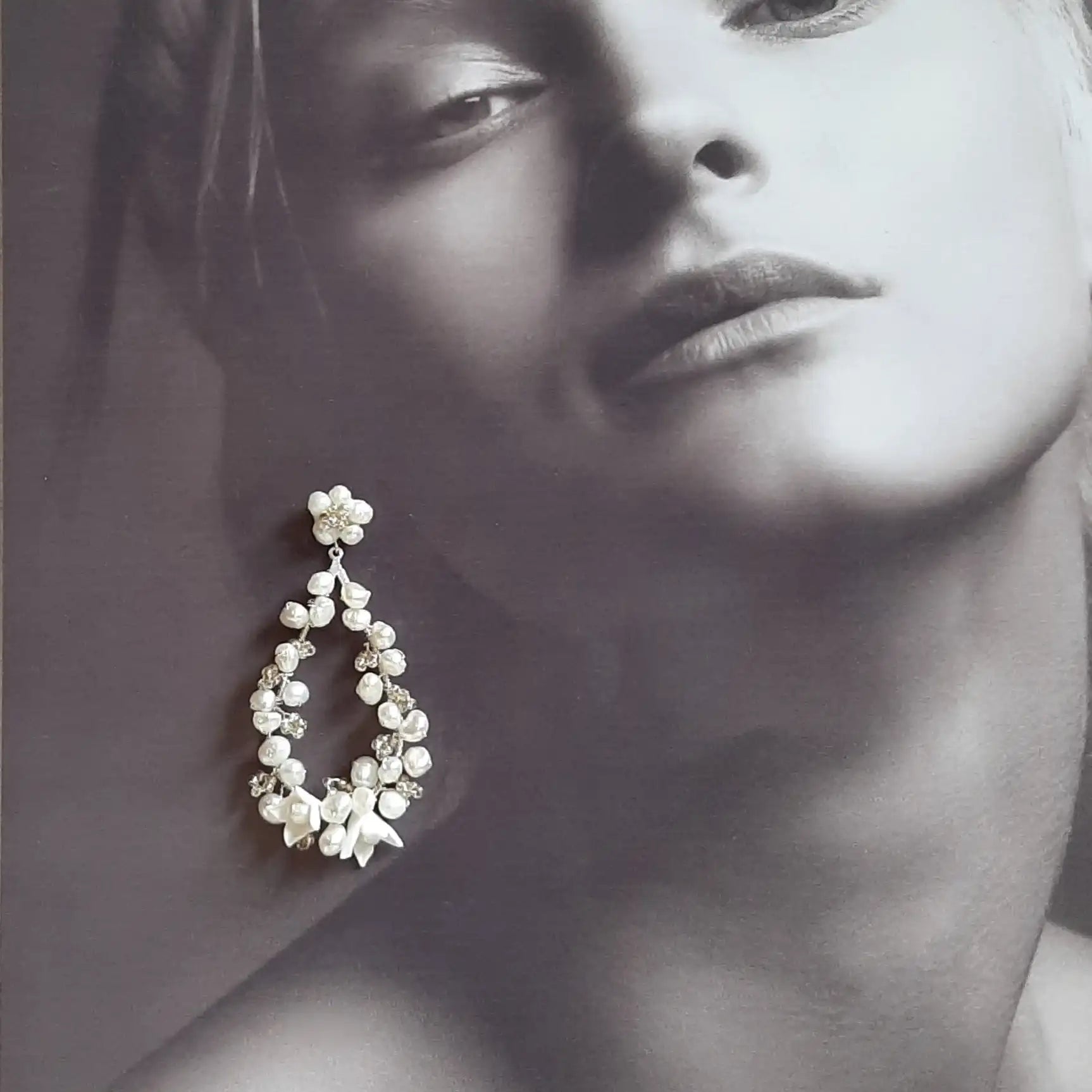 Small handmade polymer clay flowers and freshwater pearls cascade effortlessly from the flower stud to create these romantic and bespoke pair of hoop drop earrings.