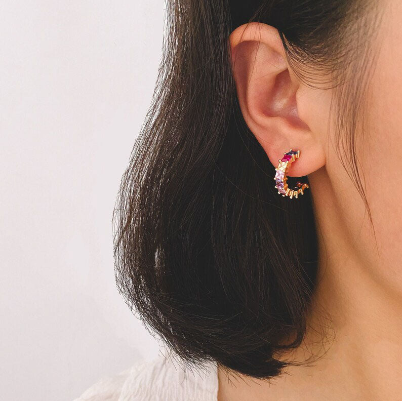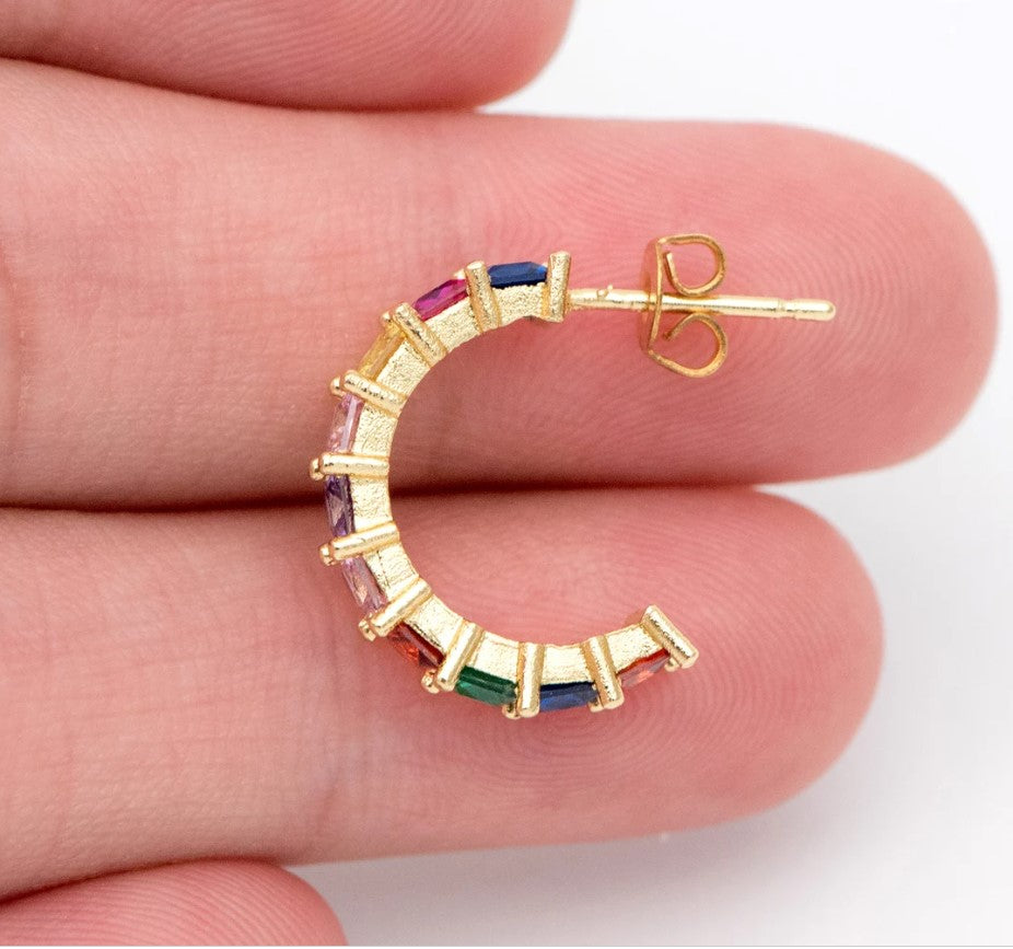 A gorgeous selection of cubic zirconias in different colours, set in a Pave setting, looks magnificent on the gold-tone curved hoops. These exquisite stud earrings possess an enchanting allure that complements any wardrobe.