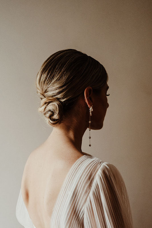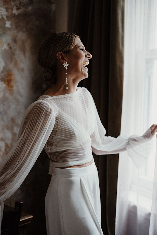 These delicate earrings are all about the detail. They have been made using lace and tiny seed beads in ivory and silk lustre. Each tiny bead has been hand woven onto the lace, and also woven into petals to form these beautiful bespoke studs. Cascaded from the studs are delicate sterling silver or gold-tone threads dripping with crystal pearls.