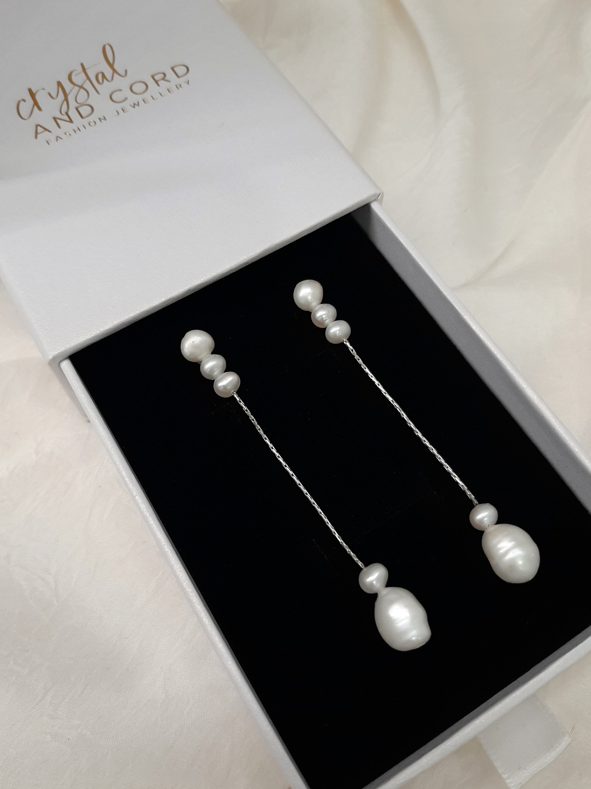 These stunning earrings feature a graceful cascade of natural cultured freshwater pearls, strung delicately on a sterling silver Boston thread they create an elegant, elongated look. Perfect for special occasions or adding a touch of sophistication to your everyday style, these earrings embody timeless elegance and natural beauty.
