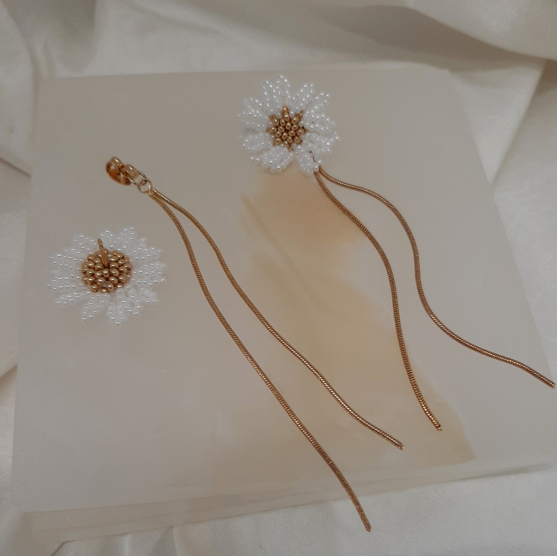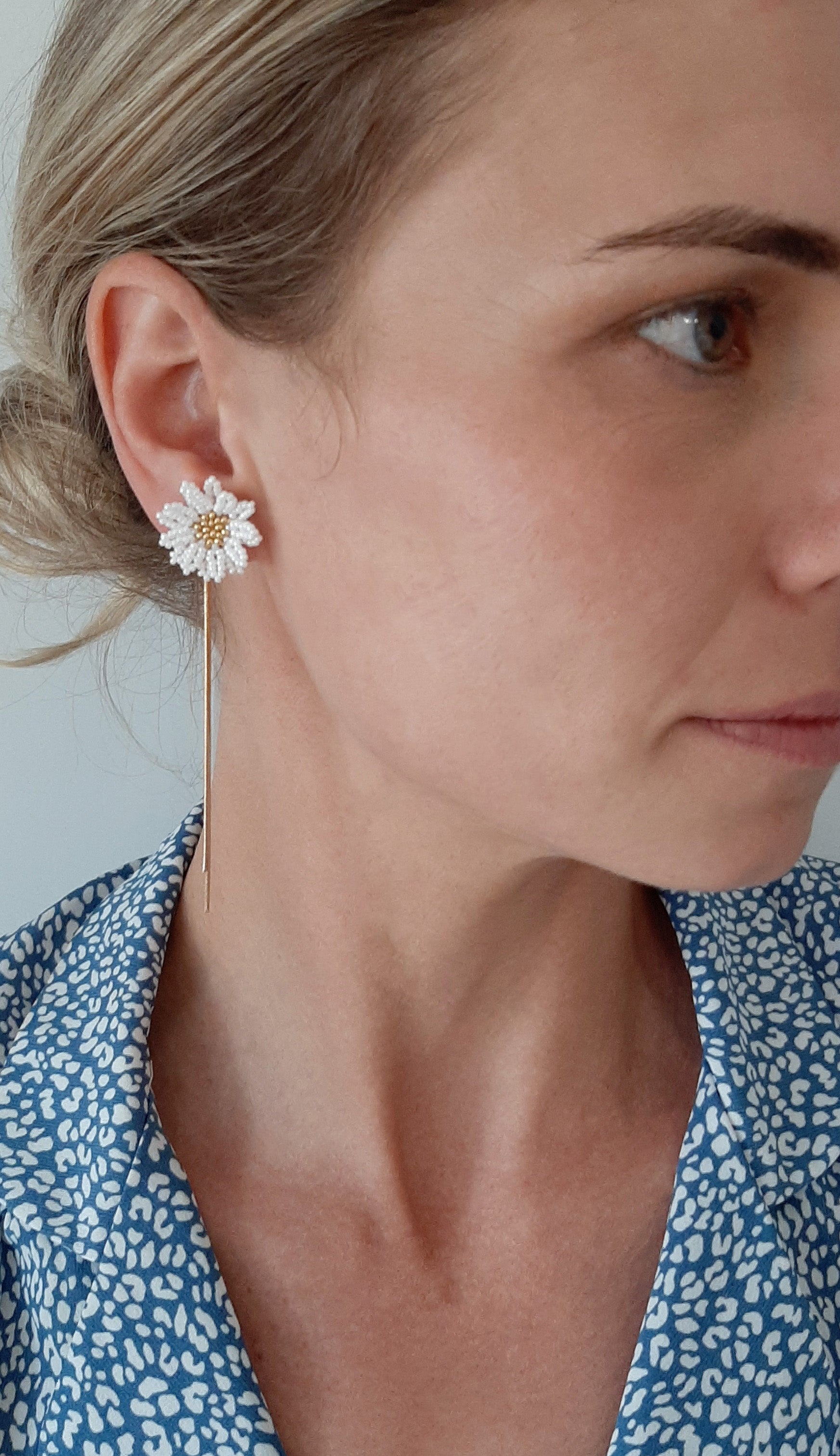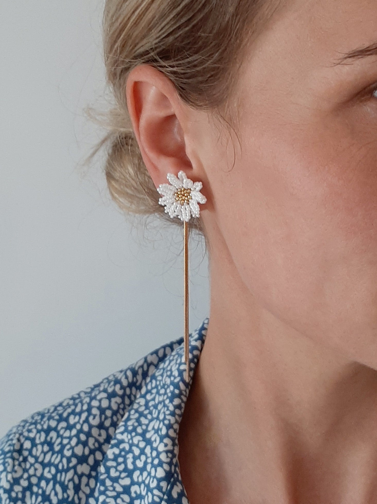 These daisy earrings have been hand made with the tiniest little seed beads, and they have a heart of gold. The daisy earstuds can be worn on their own or with the cascading chains. The choice is yours.