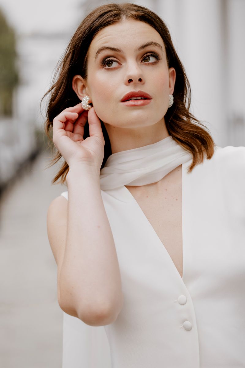 The Eloise earrings are a refined beaded huggie design, created for the bride who wants just a touch more detail. Sitting softly against the ear, their delicate beadwork adds texture and light without overwhelming your look.