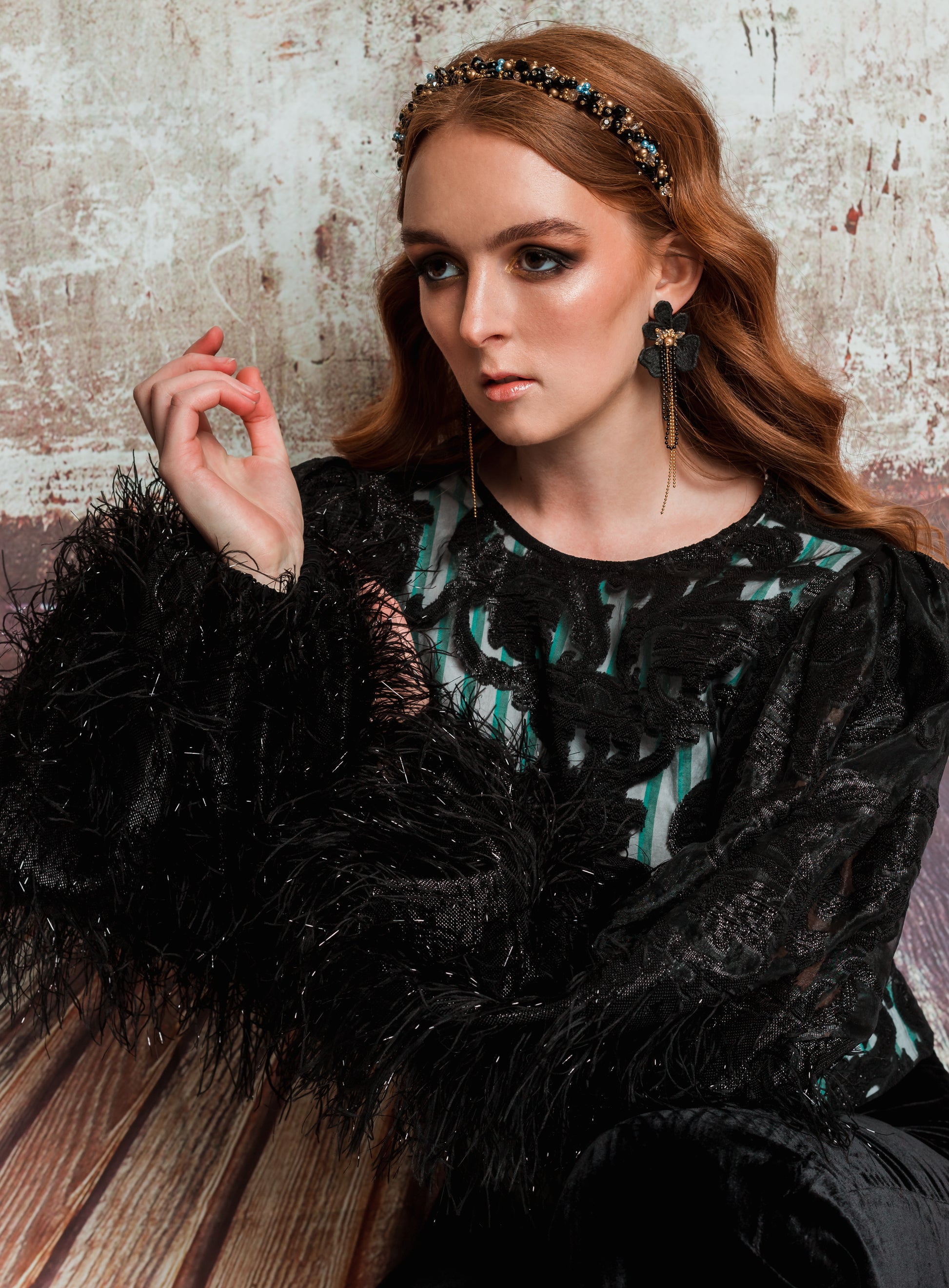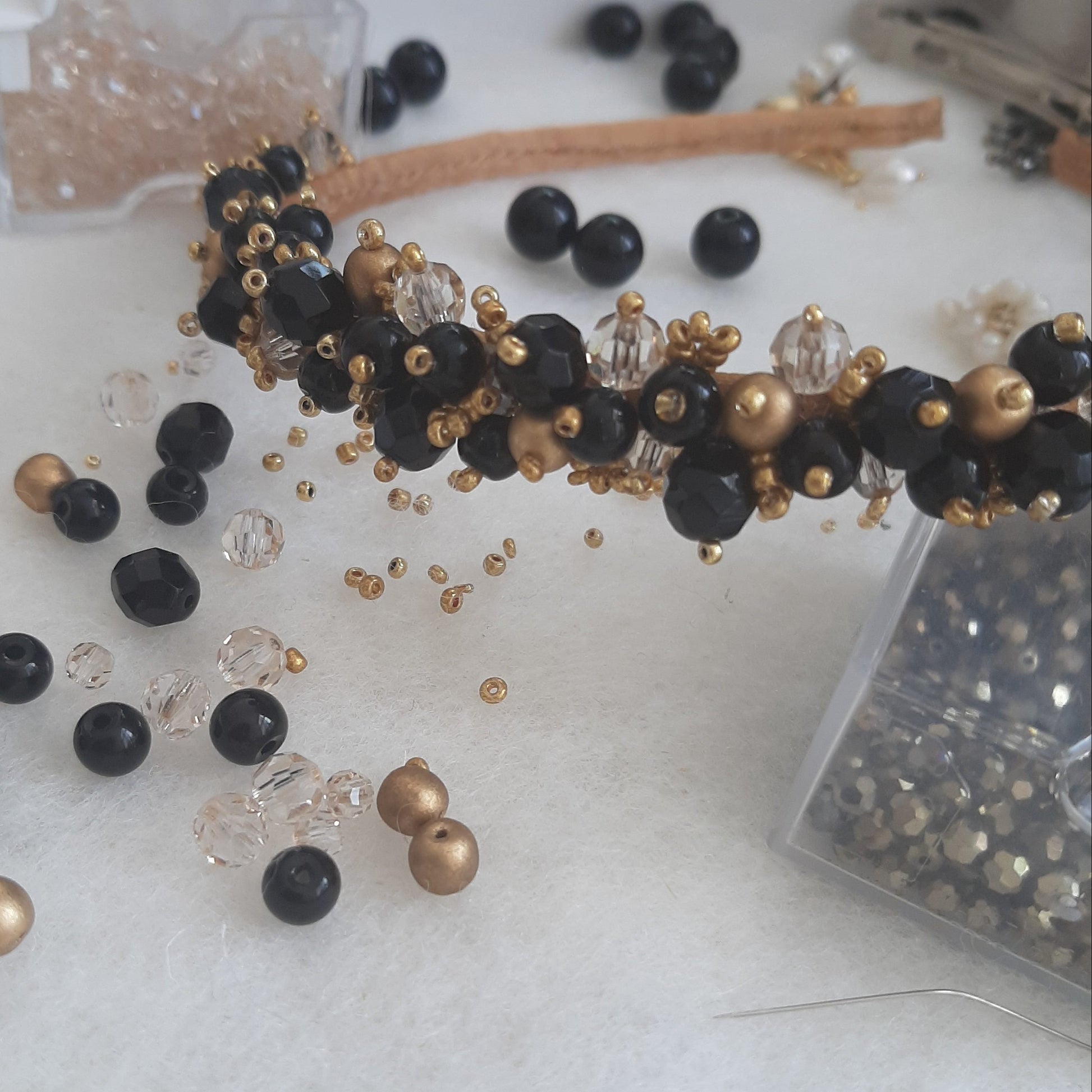 Ash - black, honey crystal, gold and a touch of blue beads handmade headband