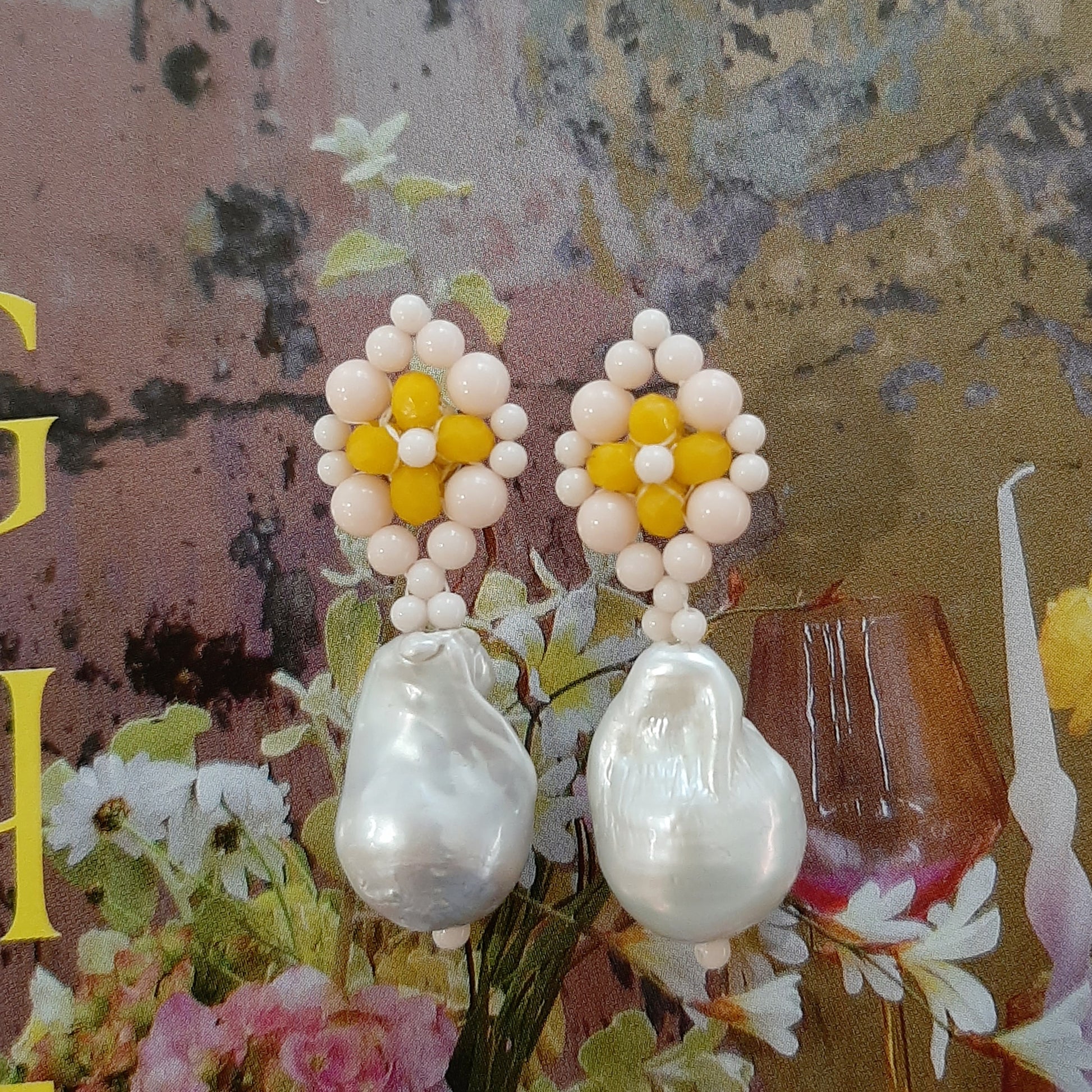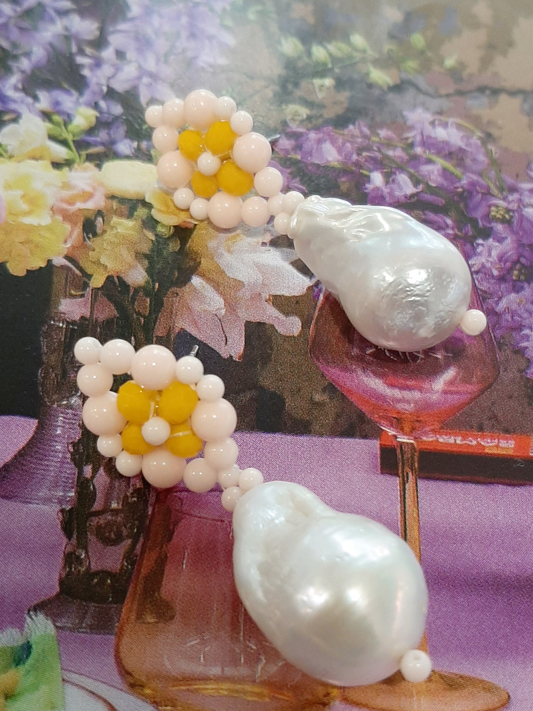 Aimee - hand beaded stud earrings and baroque freshwater pearl drop