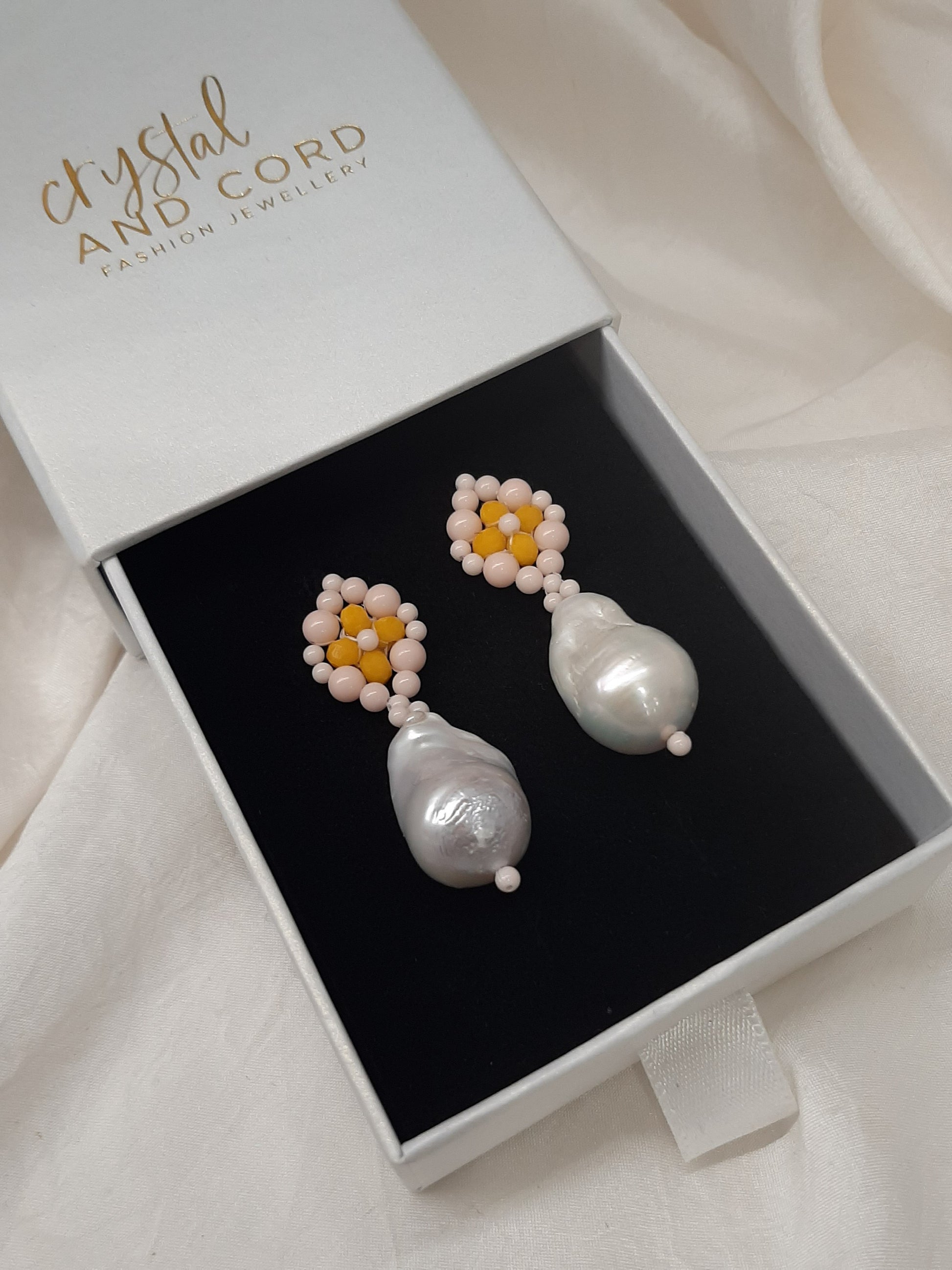 Embrace the elegance of natural beauty with the AIMEE earrings. These exquisite studs feature soft blush coral and bright coloured centered glass beads, meticulously woven together to create a romantic, bespoke design. Suspended below is a single, glorious natural cultured freshwater baroque pearl drop, celebrated for its unique organic shape, adding a touch of sophistication.