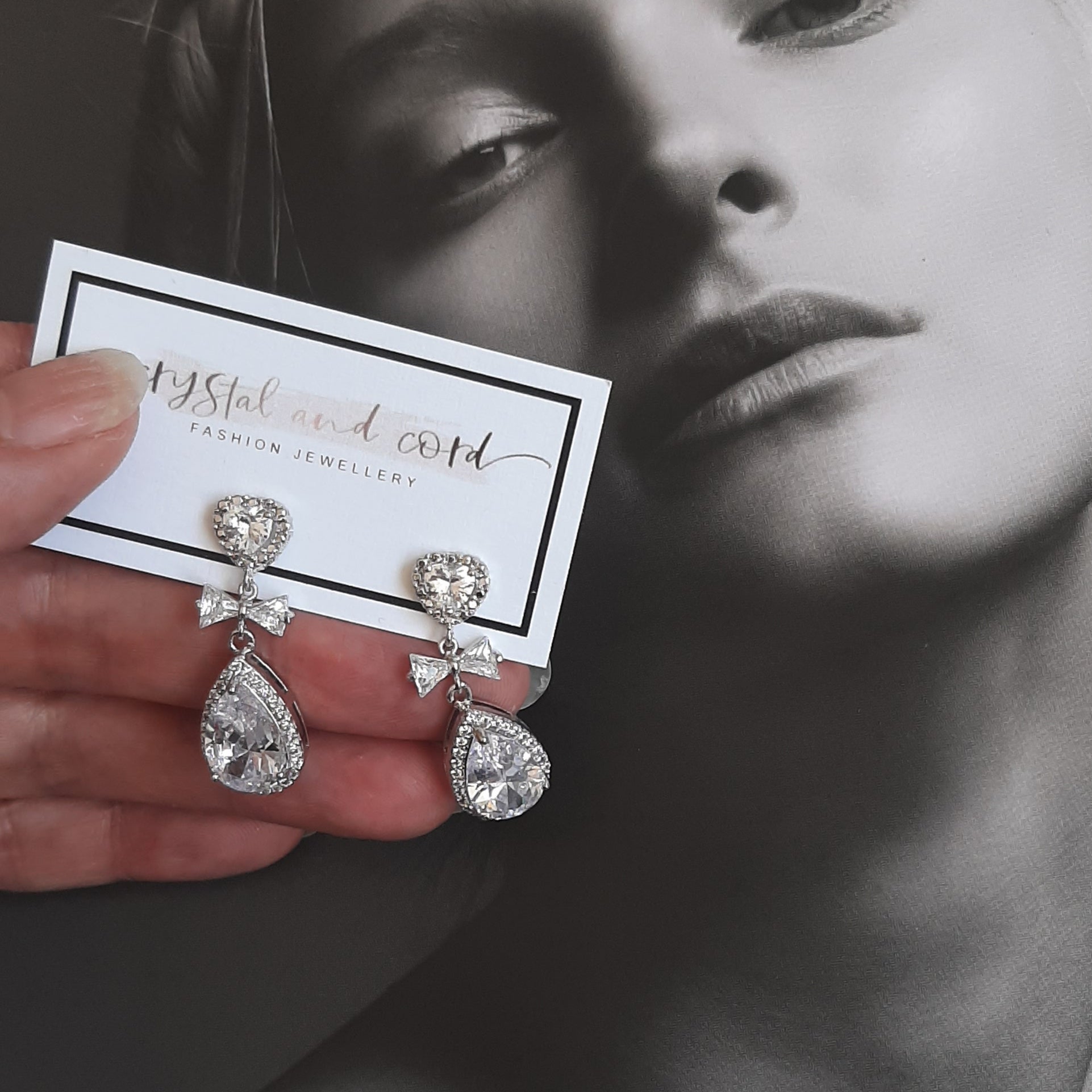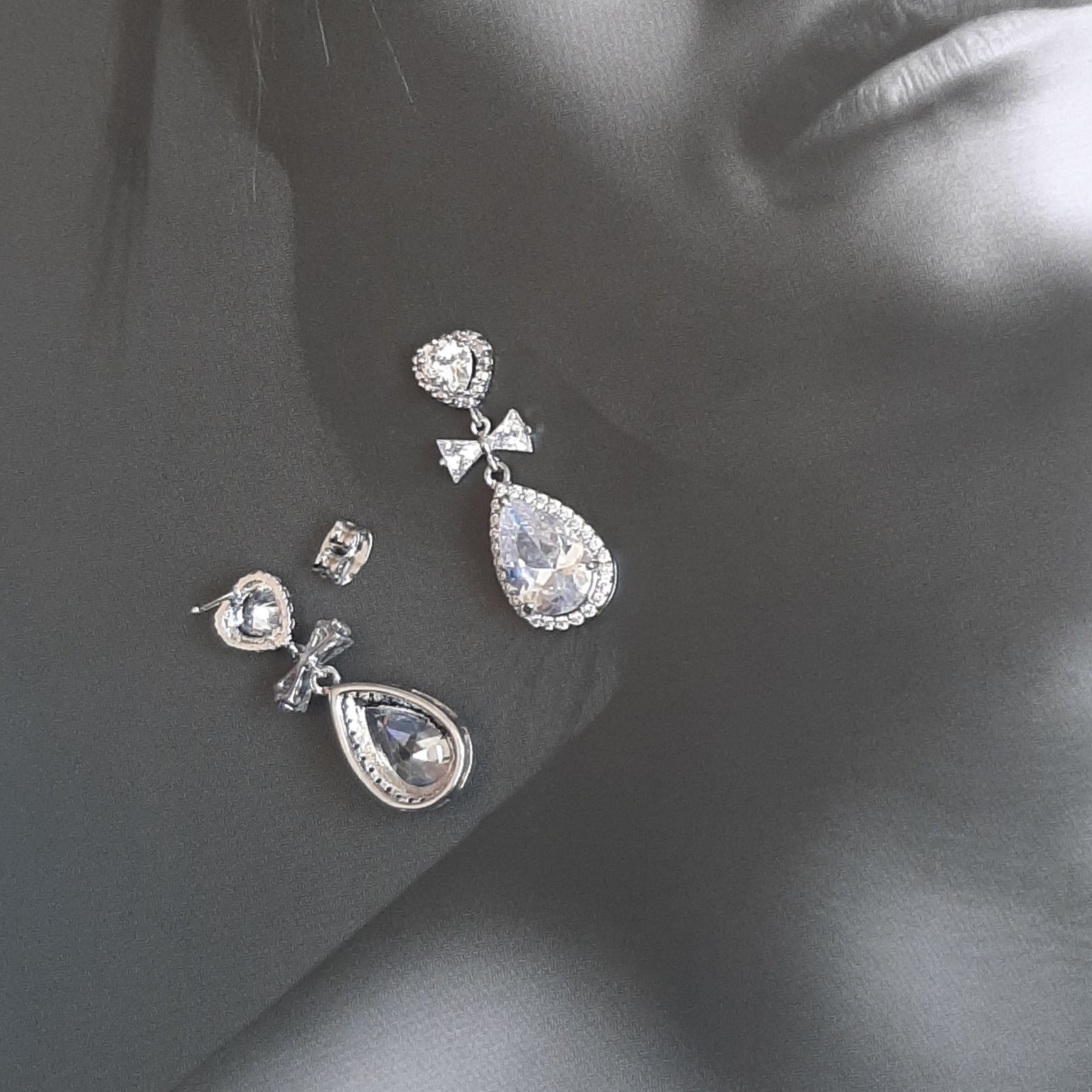 Introducing a breathtaking pair of bow and pear-shaped drop earrings, adorned with delicately encrusted crystal-clear cubic zirconia stones. Select from the divine heart-shaped stud or the dainty ear wire for a touch of personalized elegance. Meticulously crafted, these earrings exemplify exquisite intricacy and demonstrate an exceptional attention to detail. And, not to be understated, their brilliance rivals that of diamonds, ensuring you sparkle with every wear.