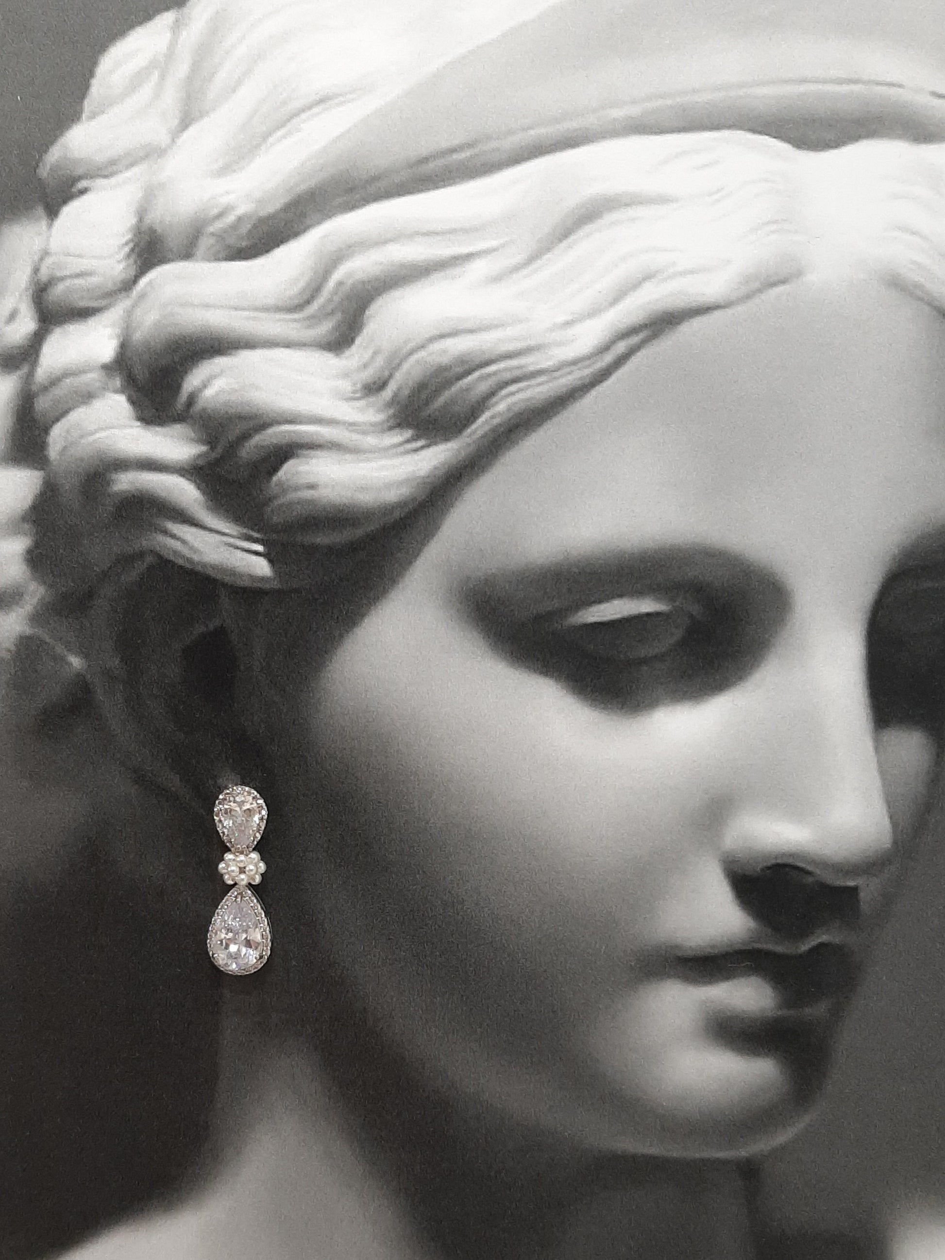 A stunning pair of cubic zirconia crystal-clear pear-shaped drop earrings that sparkle like diamonds. These intricately crafted drops showcase magnificent attention to detail. Choose from two elegant styles, both featuring a pear-shaped ear stud and a pendant drop bead. The difference lies in the middle section, where you can opt for a ring of lustrous pearls or a single round cubic zirconia.