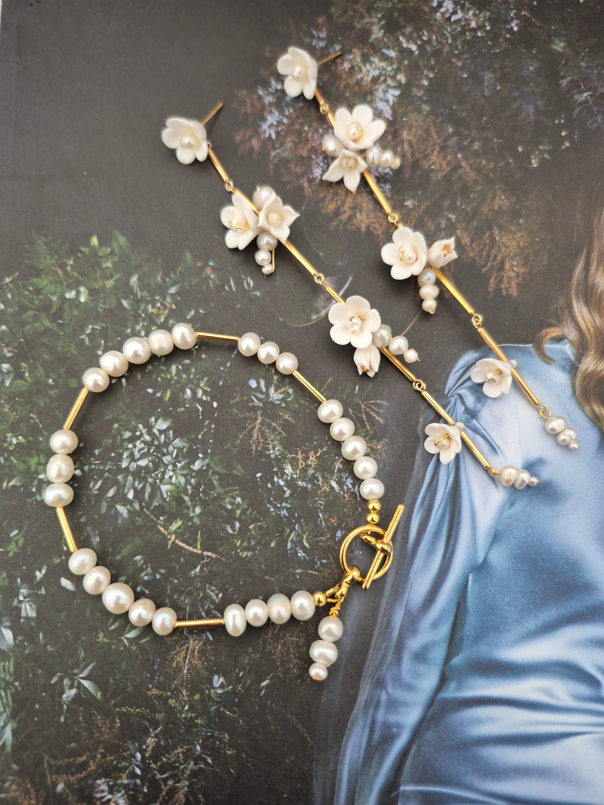 Measuring an enchanting 12cm in length, your earrings feature clusters of hand-sculpted polymer clay flowers and luminous pearls, artfully arranged with dainty gold-plated tube spacers to create a fluid, cascading effect.
