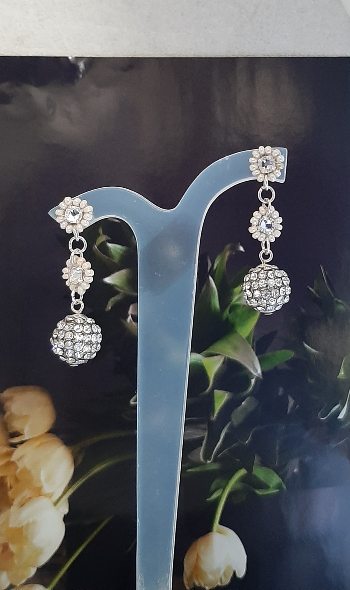 Just the right amount of sparkle for these heavenly and intricate, silver and crystal pave balls suspended from Swarovski crystal rhinestone flower shaped earstuds and drop.
