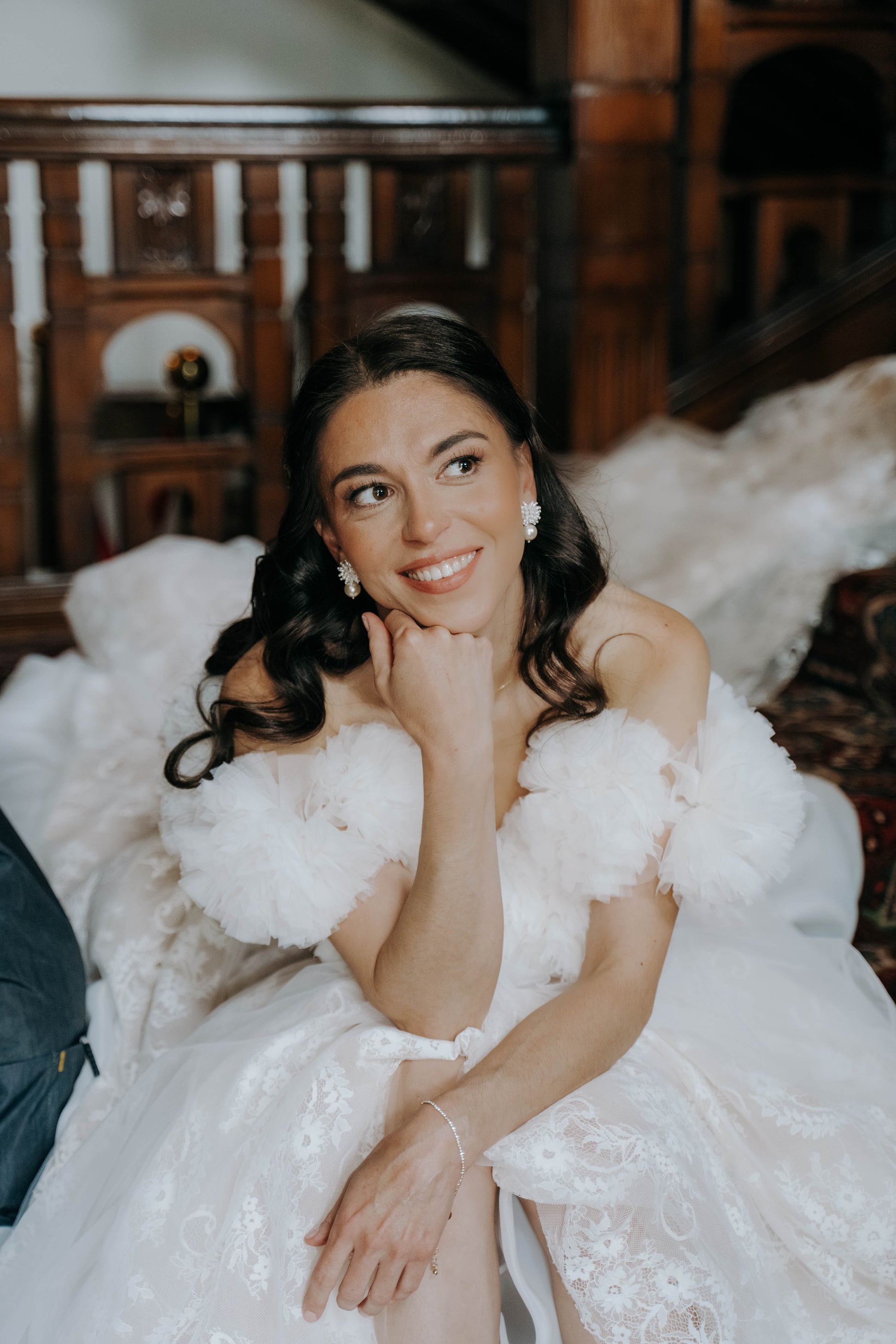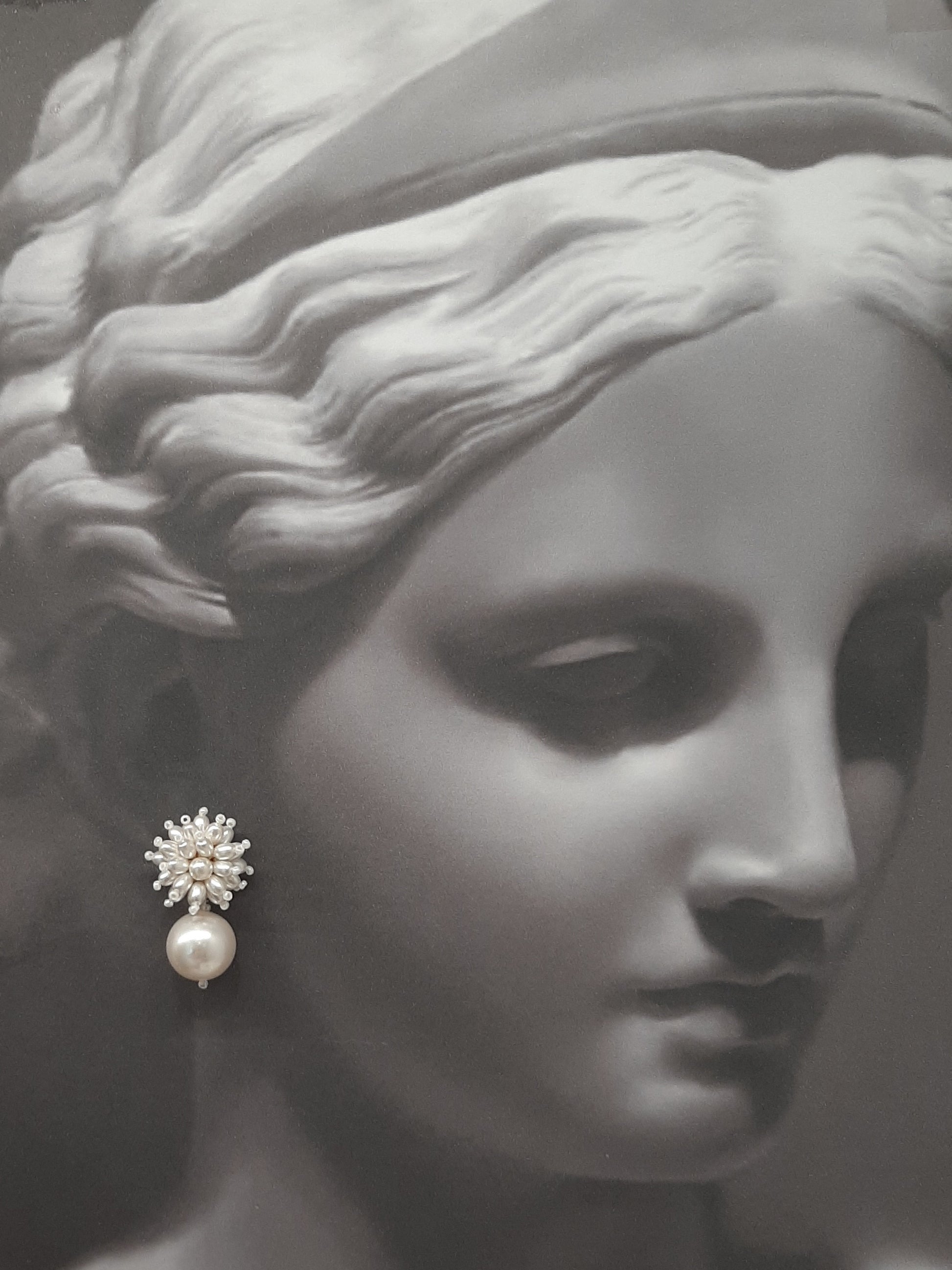 Crafted with exquisite care, these stud earrings feature stunning rice-shaped crystal beads intricately woven into a radiant flower design. Delicately suspended below the studs is a round, lustrous crystal pearl. This heirloom-quality pair will add an elegant touch to your wedding day style.