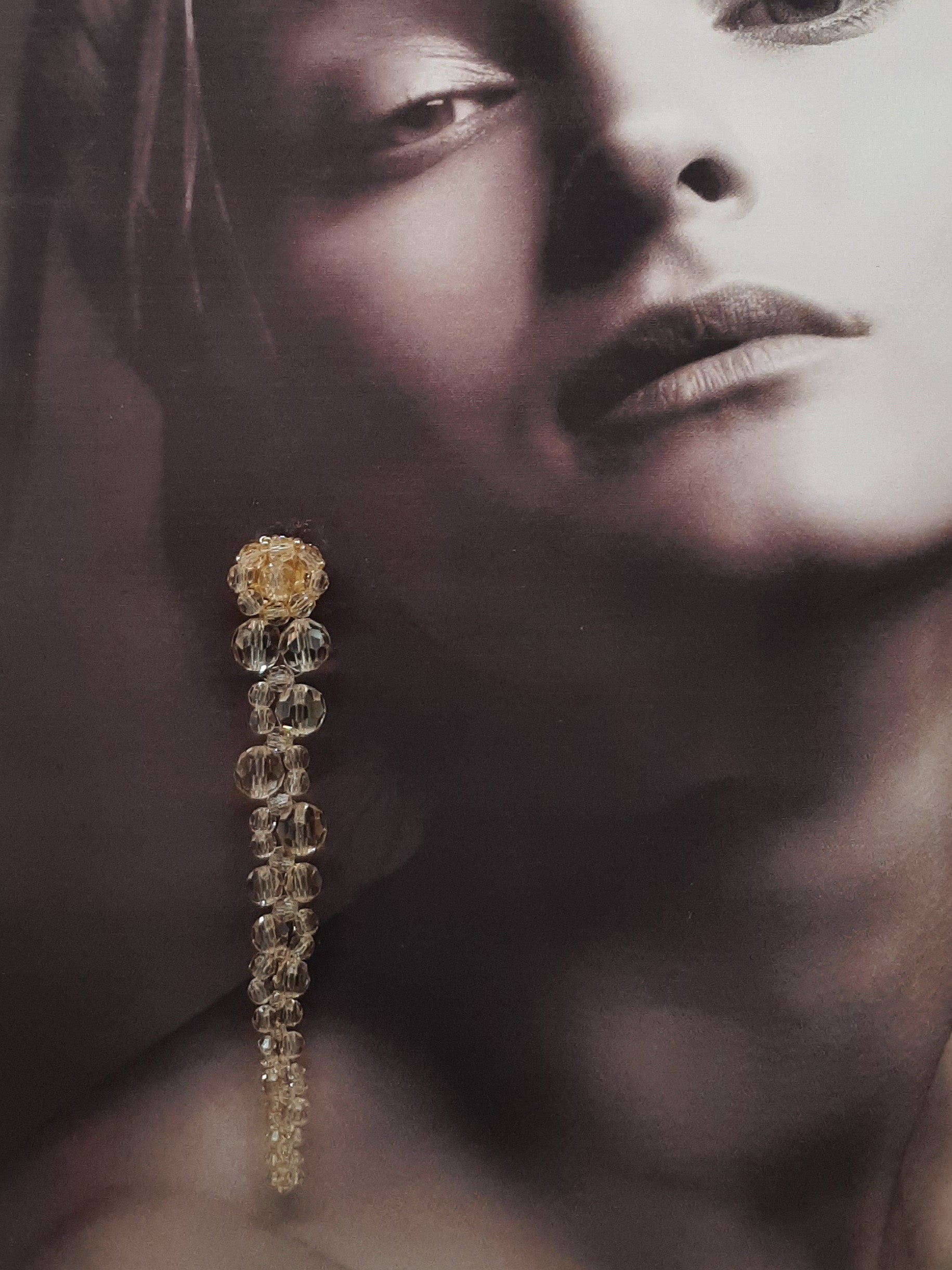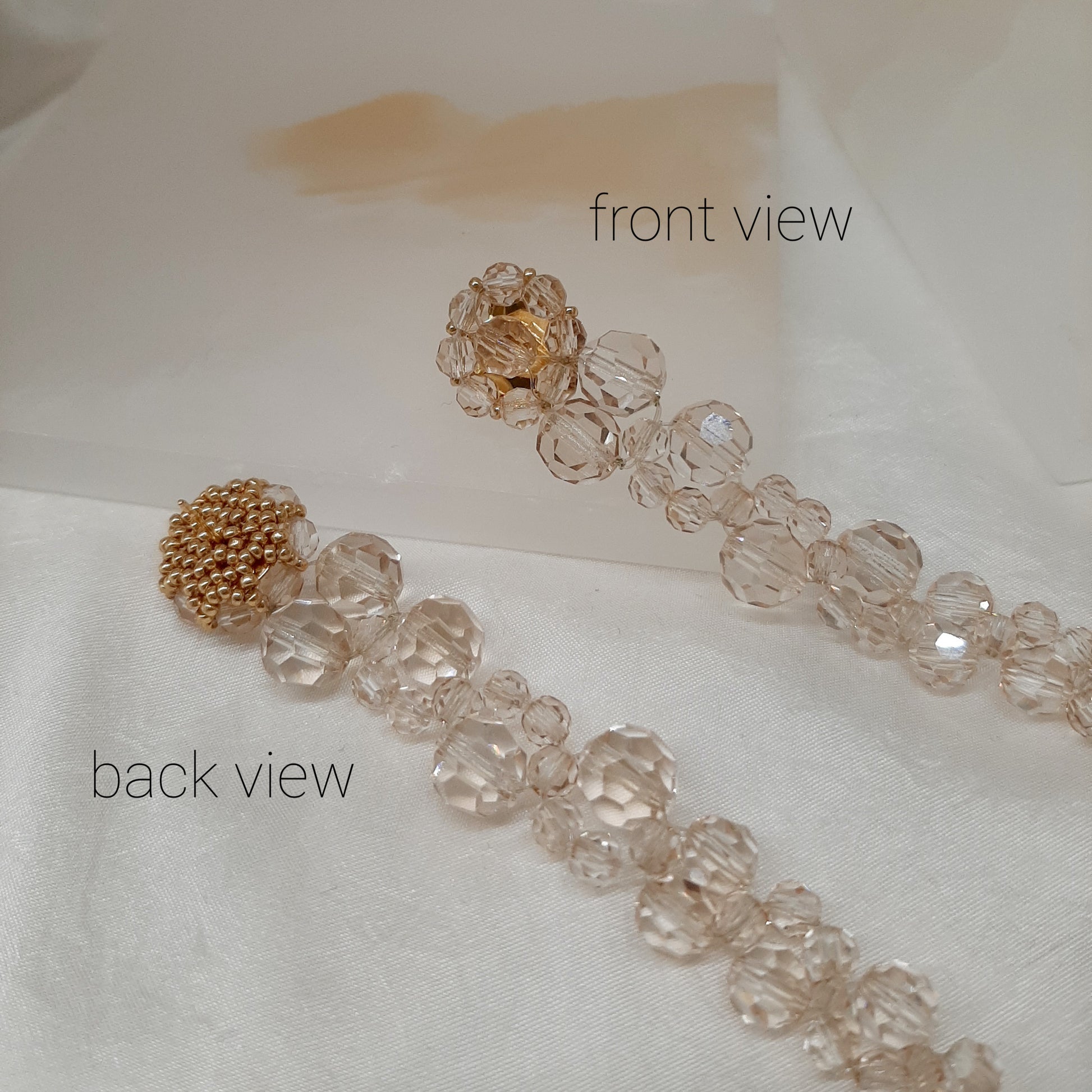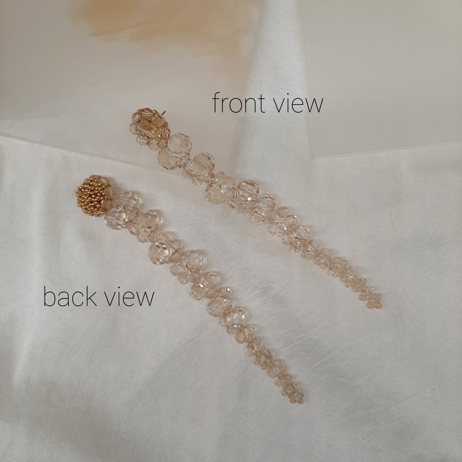 Czech crystal faceted beads are woven together on a clear thread, and then cascaded from the flower shaped earstuds to make these surprisingly light earrings. The studs have been handmade using a beading technique called Peyote Stitch. Examples of peyote stitch have been found in artifacts dating back to ancient Egypt.