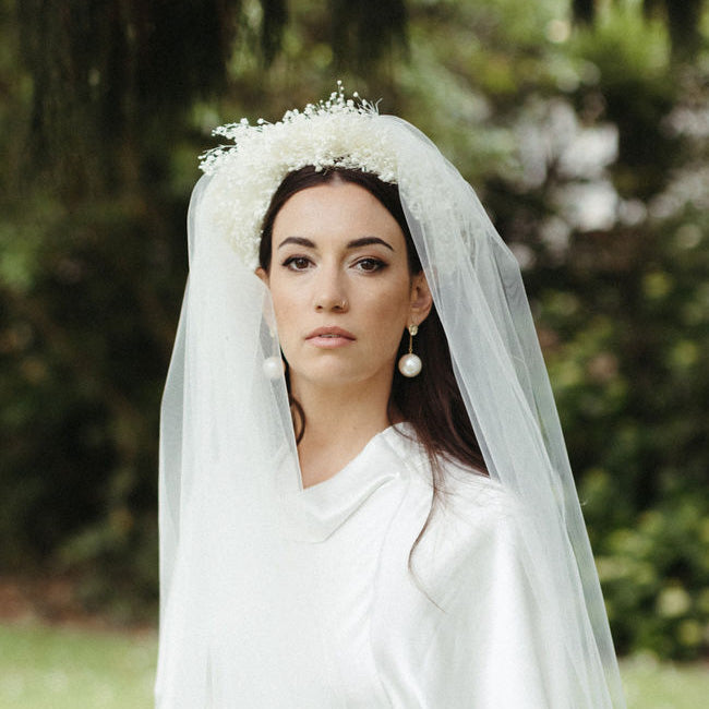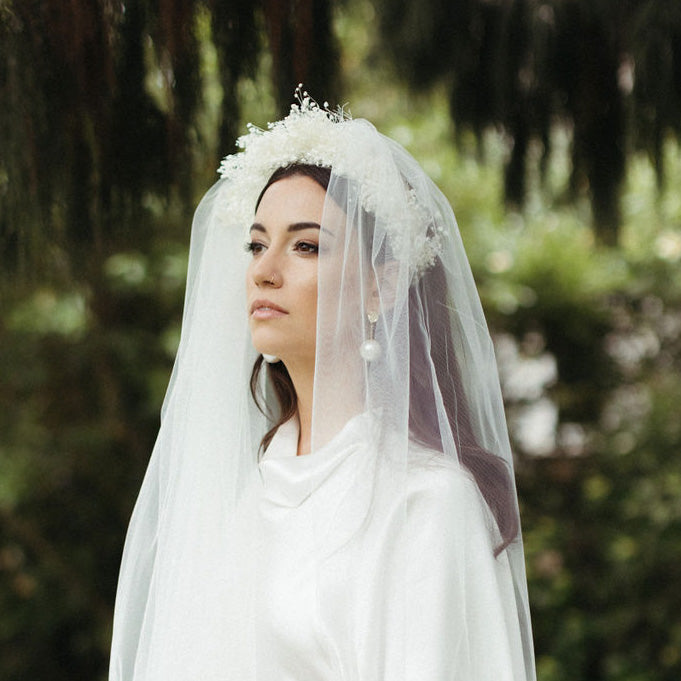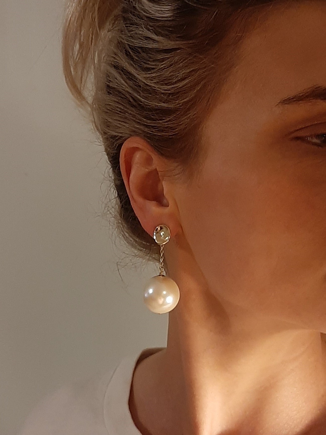 The large Japanese acrylic pearl is lightweight and suspends beautifully from the gold-tone earstuds and chain. Always quite simple and very elegant.