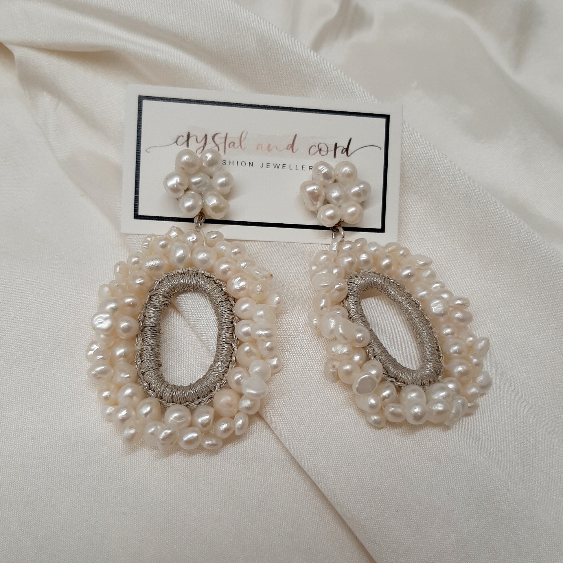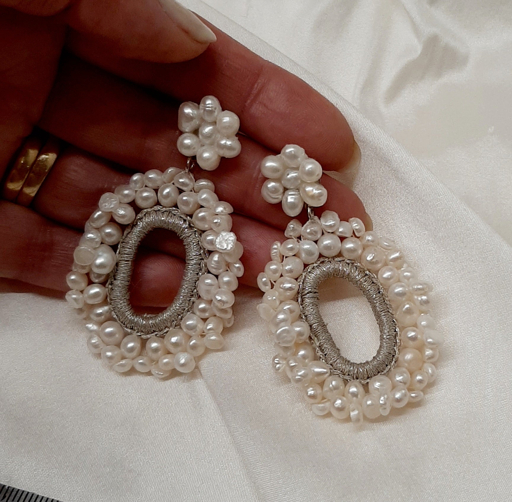 These earrings have been entirely handmade. Firstly, silver embroidery threads were crocheted around an irregular shaped oval hoop, then white freshwater pearl beads where woven onto this. These hoops cascade effortlessly from the flower shaped ear studs. The end result is a pair of earrings that are unique and well made.