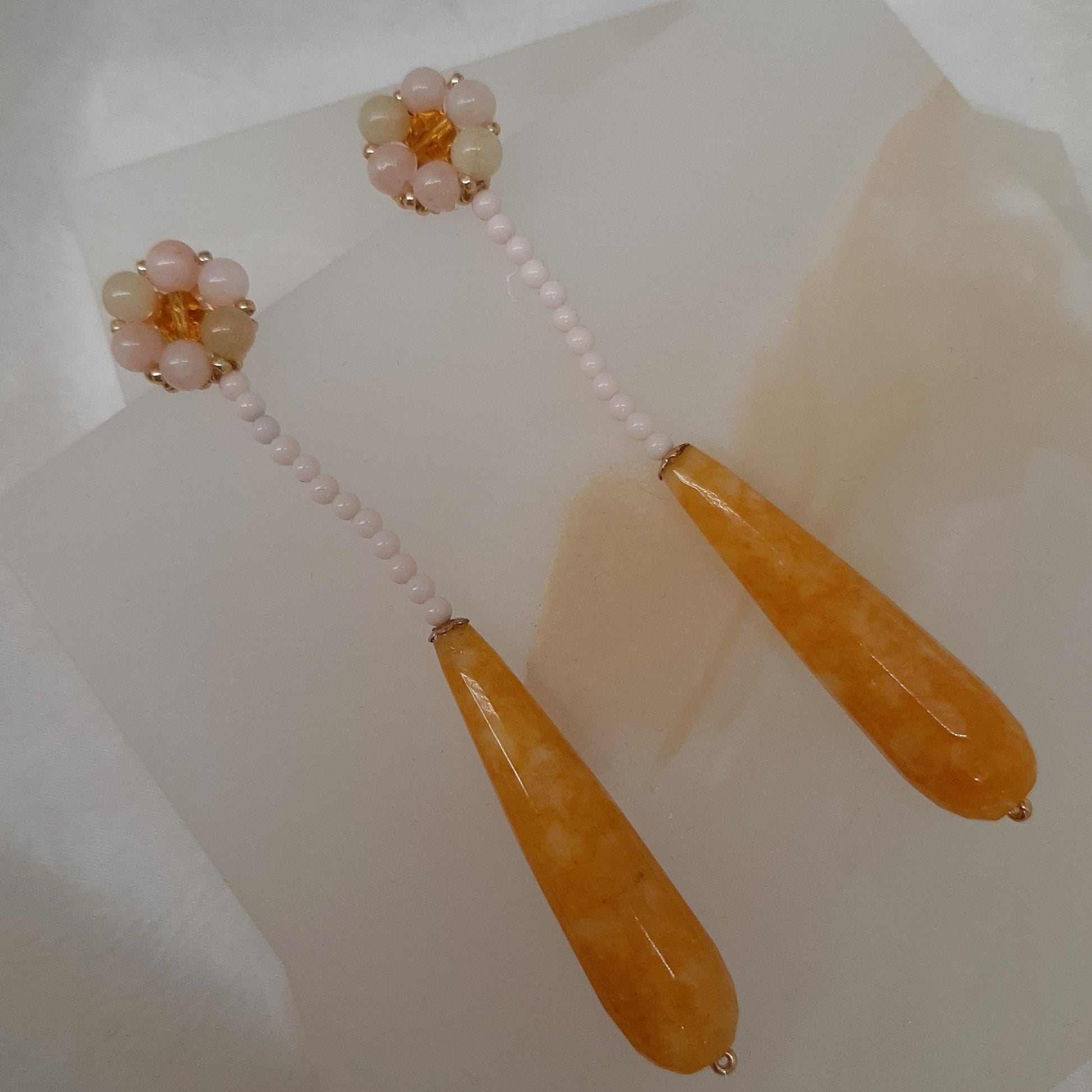 Components : Morganite gemstone beads, yellow Jade gemstone teardrop and glass beads