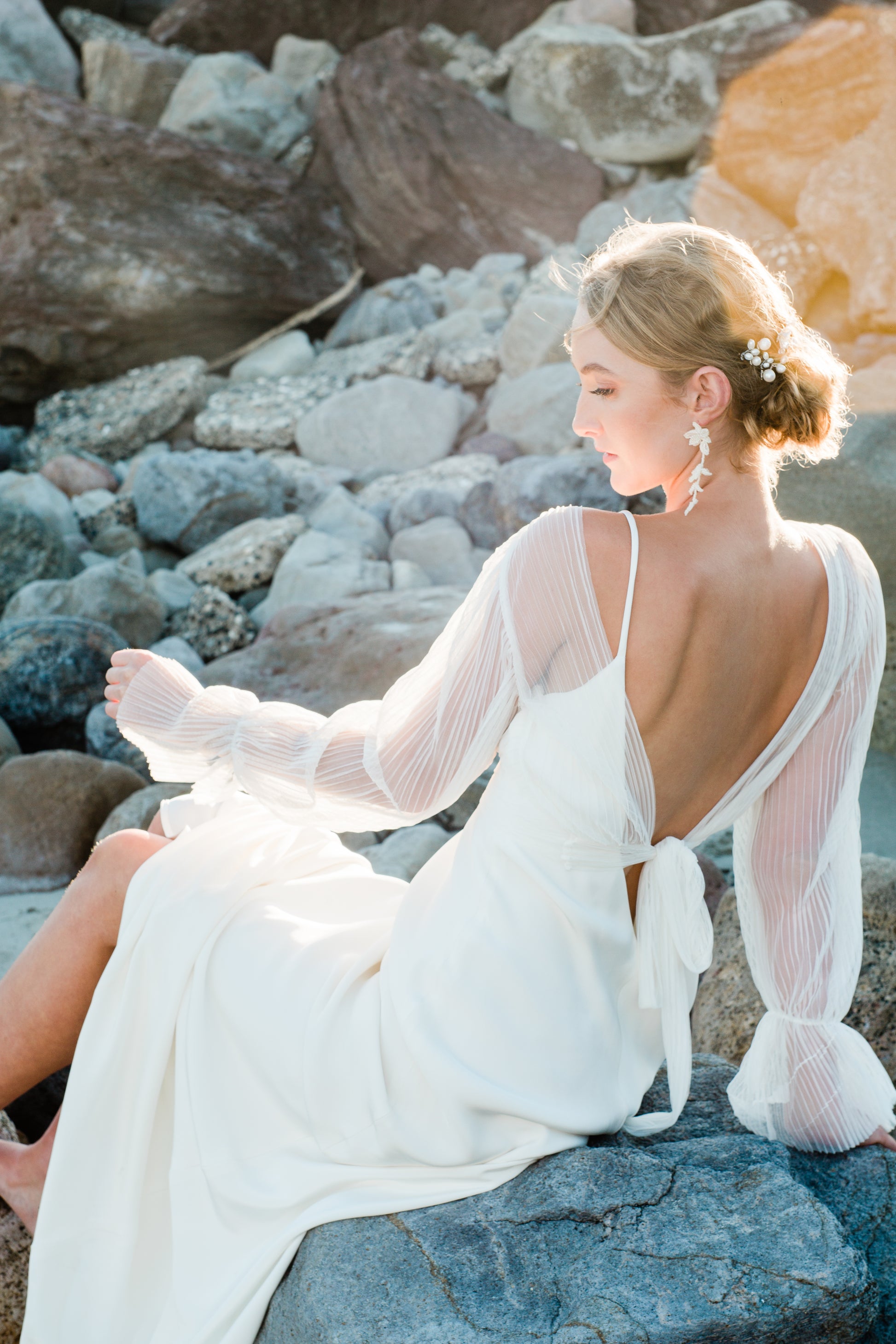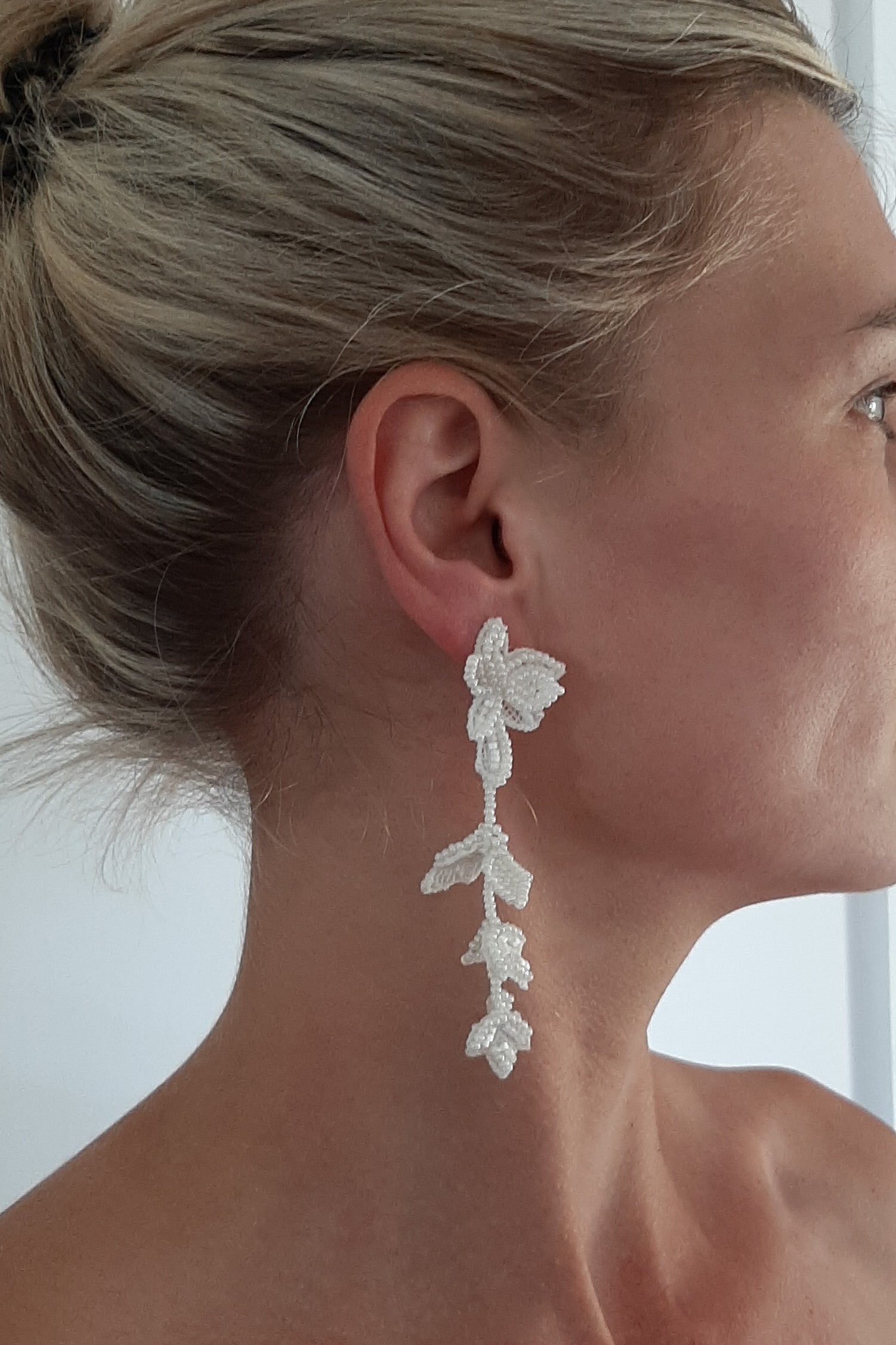These delicate earrings are all about the detail. They have been made using lace and tiny seed beads in ivory and silk luster. Each tiny bead has been hand woven onto the lace, or woven into a petal, then cascaded from the flower shaped ear stud.
