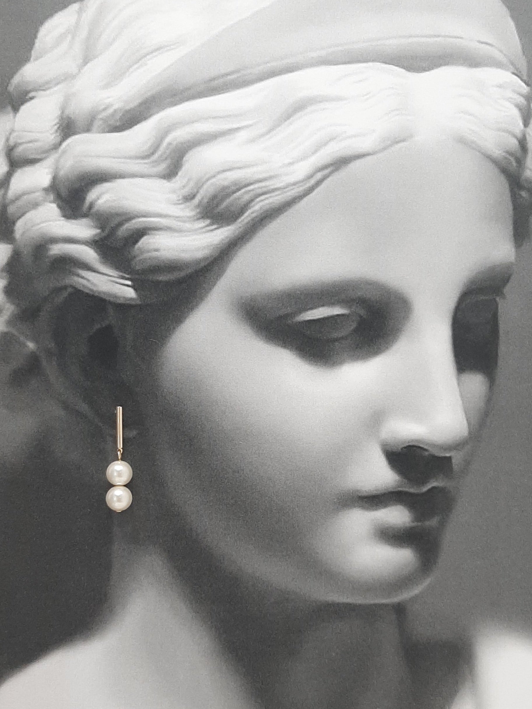 Two lustrous round pearls are suspended from a gold-tone stud bar, creating an elegant and modern pair of earrings. Add to your set with a simple one pearl drop bead necklace and a multistrand pearl statement cuff bracelet.