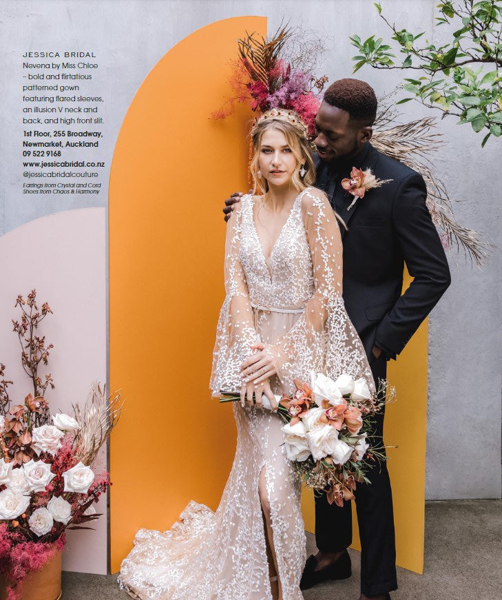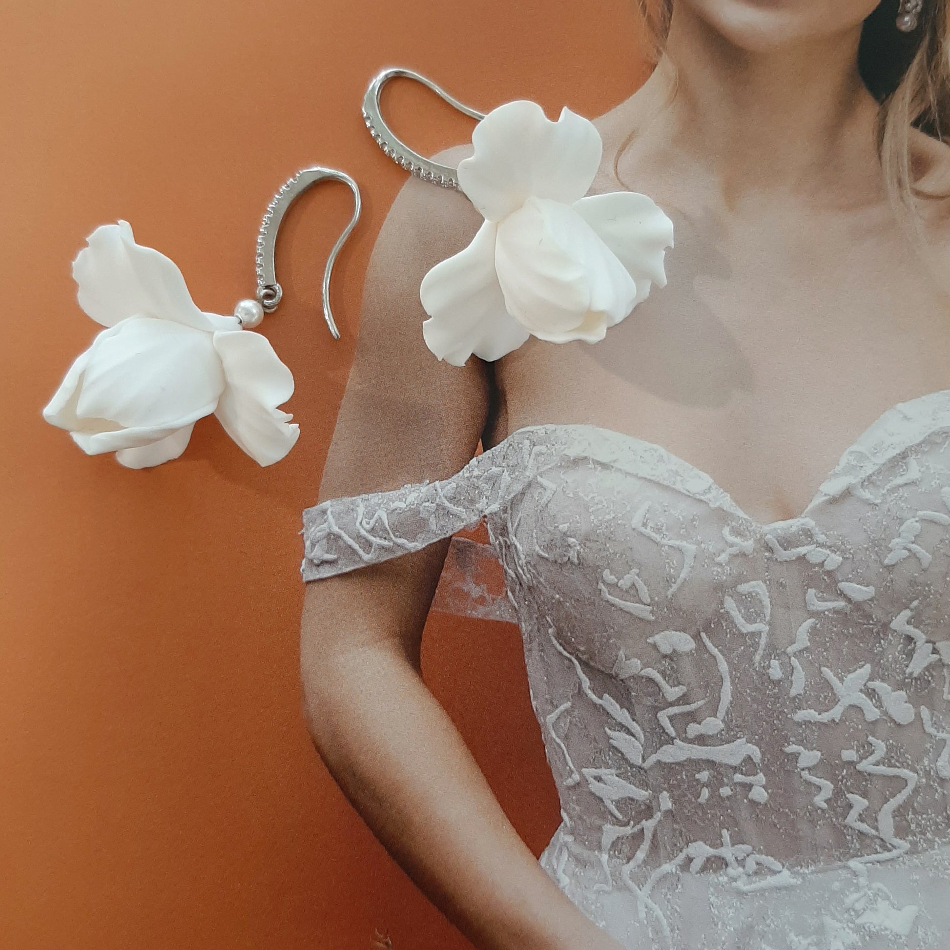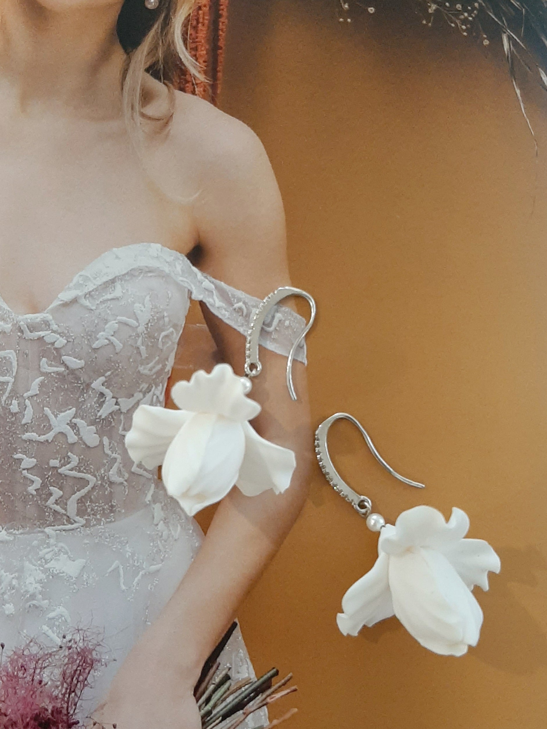 or ii) a pair of earrings with a single gorgeous white iris flower,