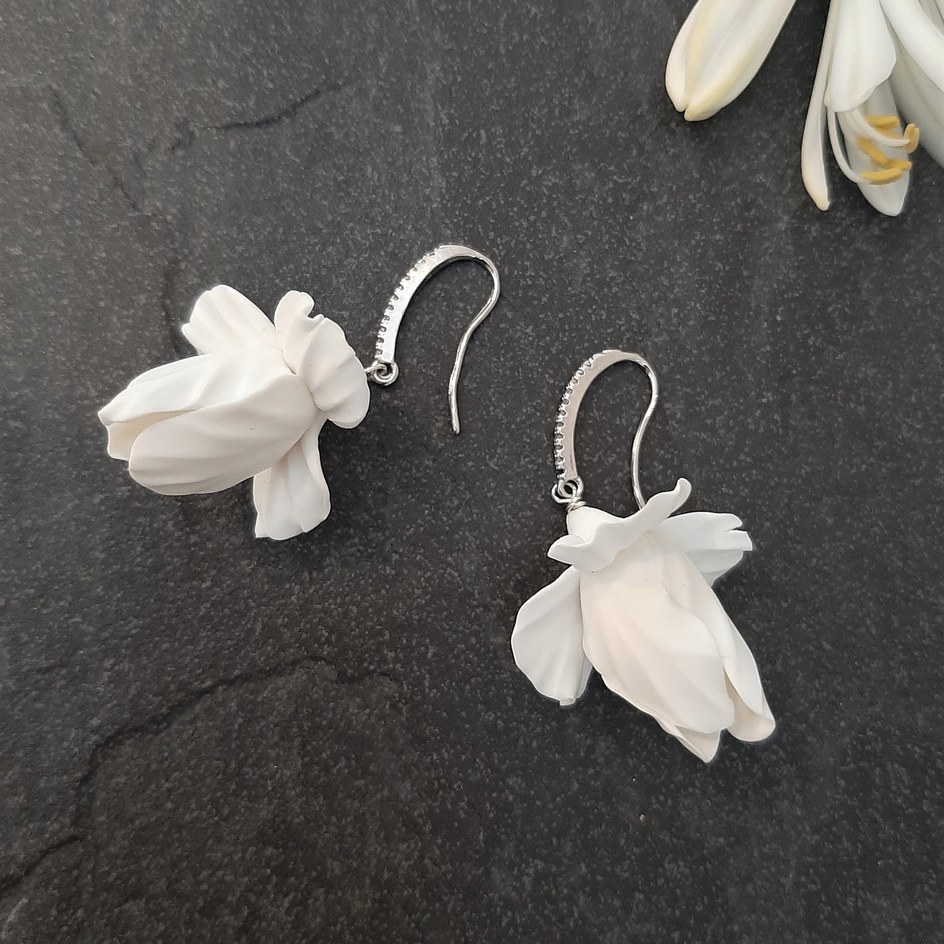 This white polymer clay iris flower sways gently from the silver-tone and cubic zirconia earwires, and they can be worn a number of ways: