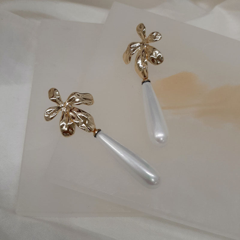 Juliette - golden orchid shape flower and cascading pearl drop earrings