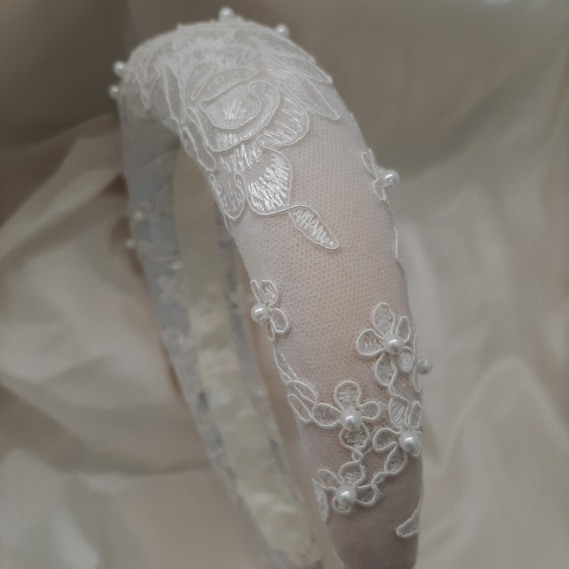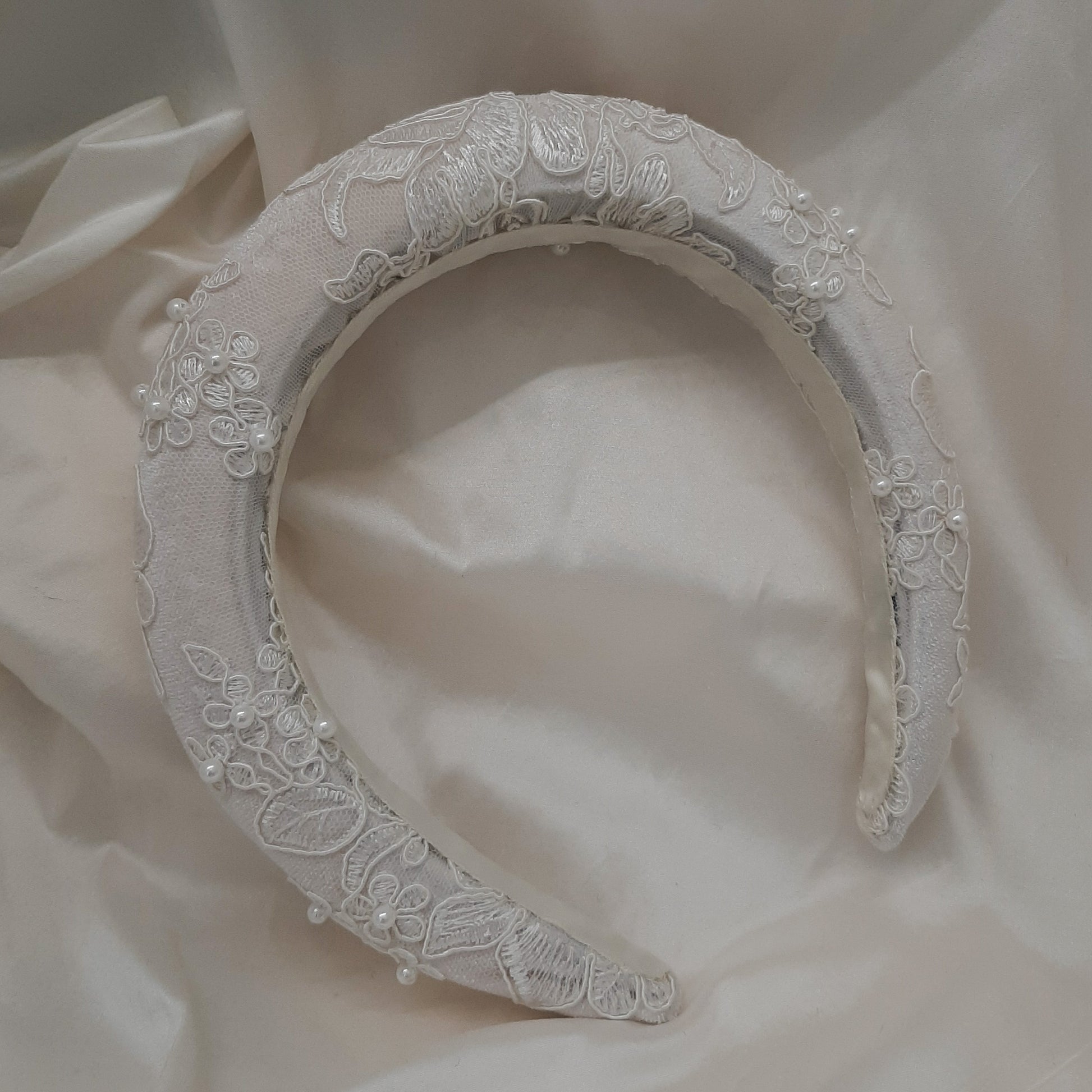 A padded headband has been covered with a glorious lace fabric, then embellished with the odd crystal pearl to create this modern styley piece.