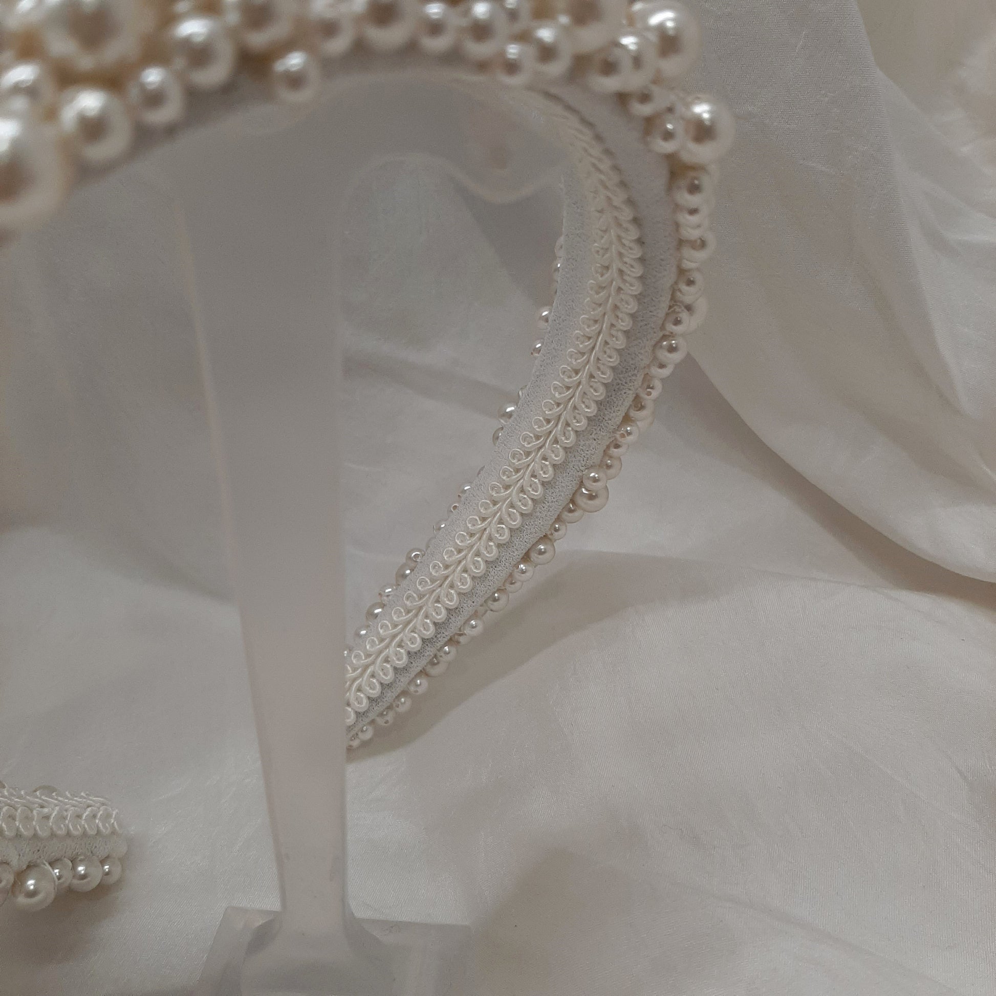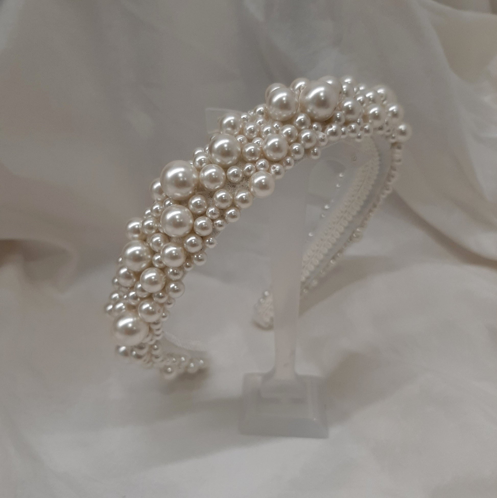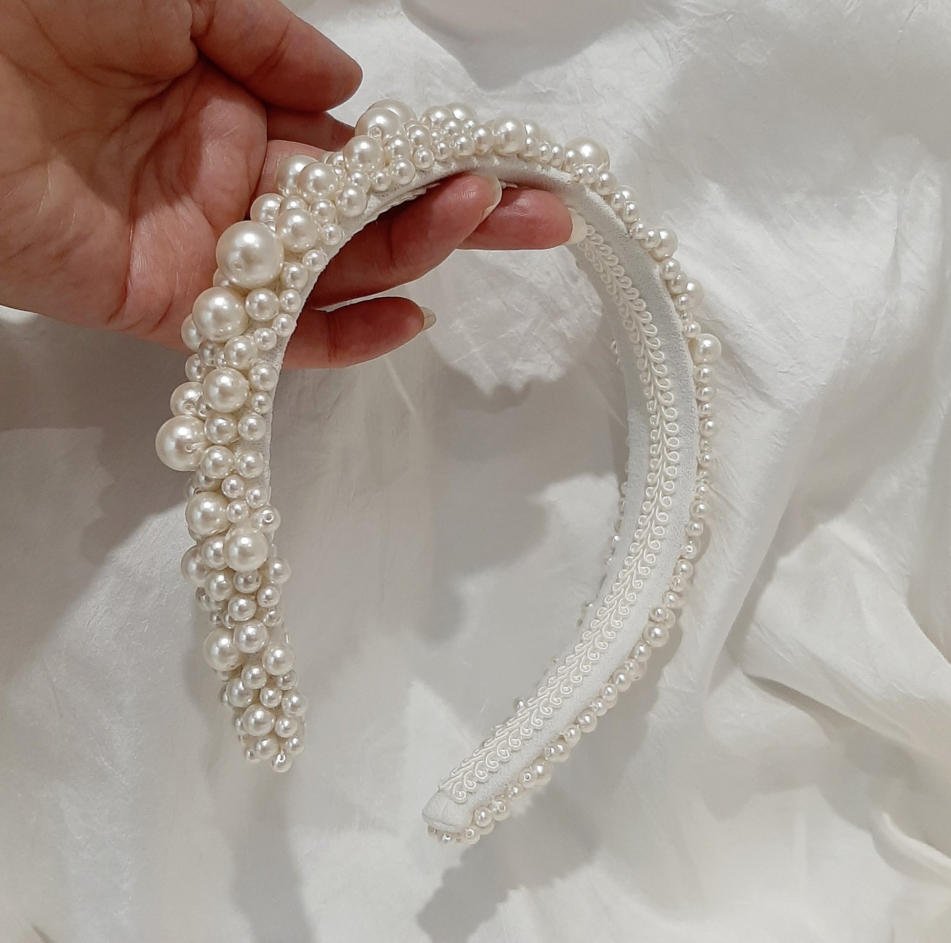 Commencing with a plush padded base, I adorned it with the softest fabric before meticulously attaching over 130 beads, varying in size from 4mm to 12mm. Each bead is hand-stitched onto the headband, culminating in a beautifully embellished pearl masterpiece.
