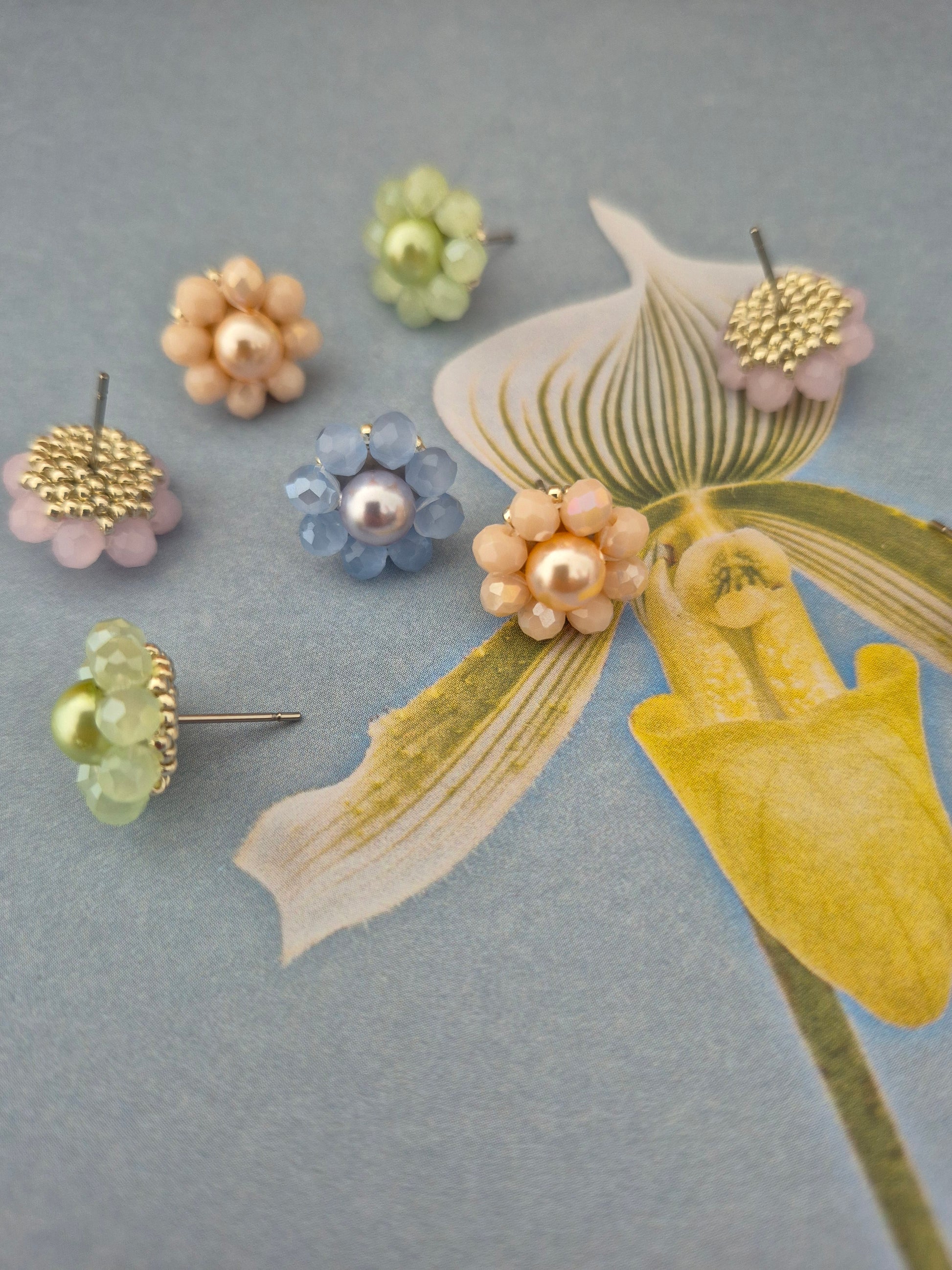 Finished with shimmering pastel beads and a smooth pearl at the centre, these studs are little pops of sunshine you can wear all season long. To make them truly yours, you can choose whether the seed bead backs are finished in silver or gold glass beads. Fresh, fun, and effortlessly timeless. 🌸