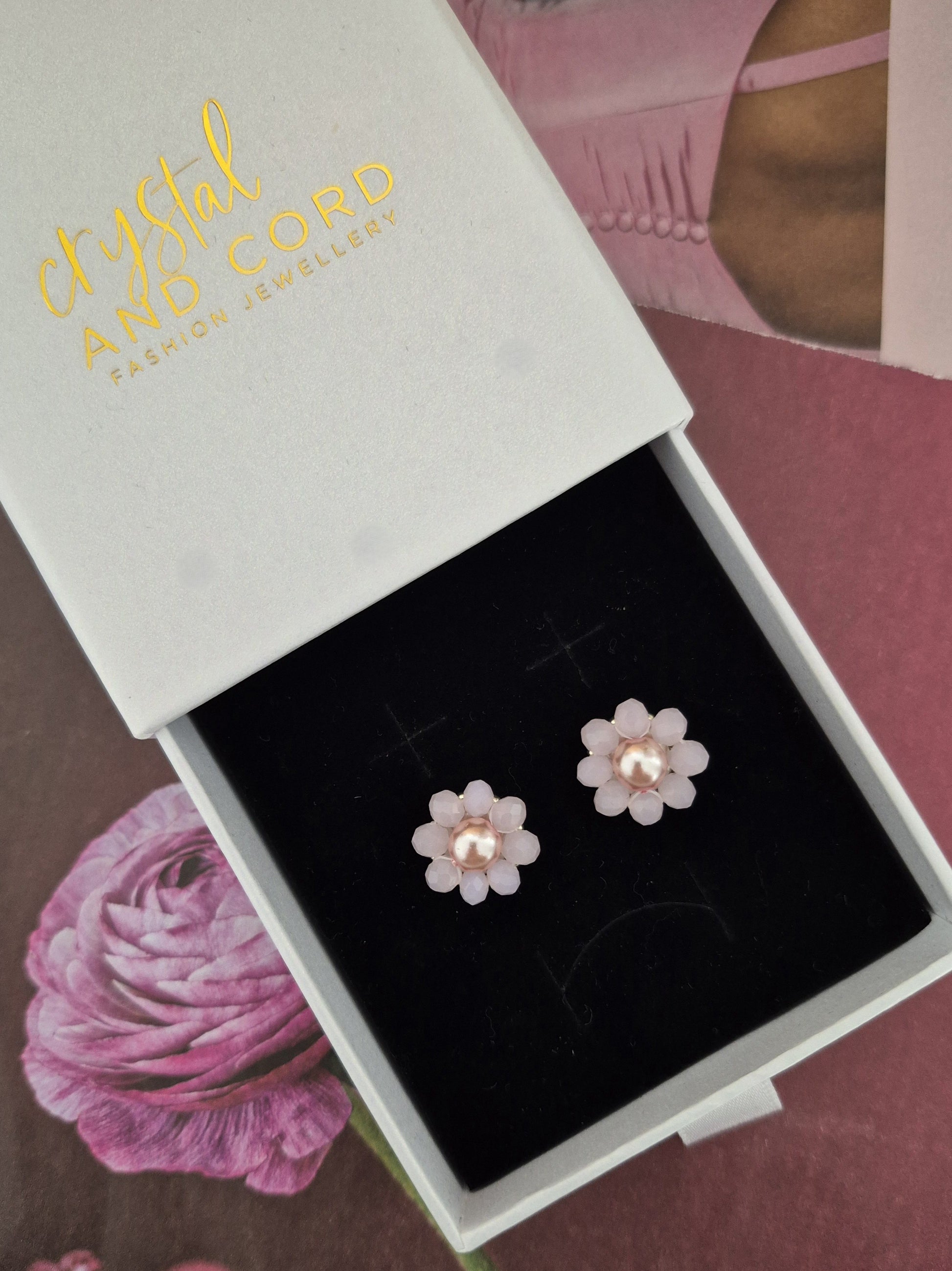 Maddie - flower shaped stud earrings with glass beads and a pearl center