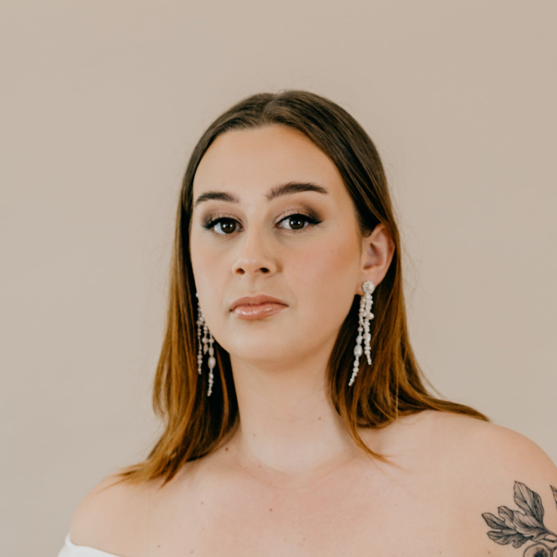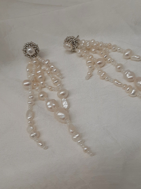The Mariah earrings are elegant and extremely modern. Several cultured freshwater pearls have been handstrung to create these naturally organic cascading earrings. The studs have also been handmade with tiny silver seed beads and a freshwater pearl has been added to the center.