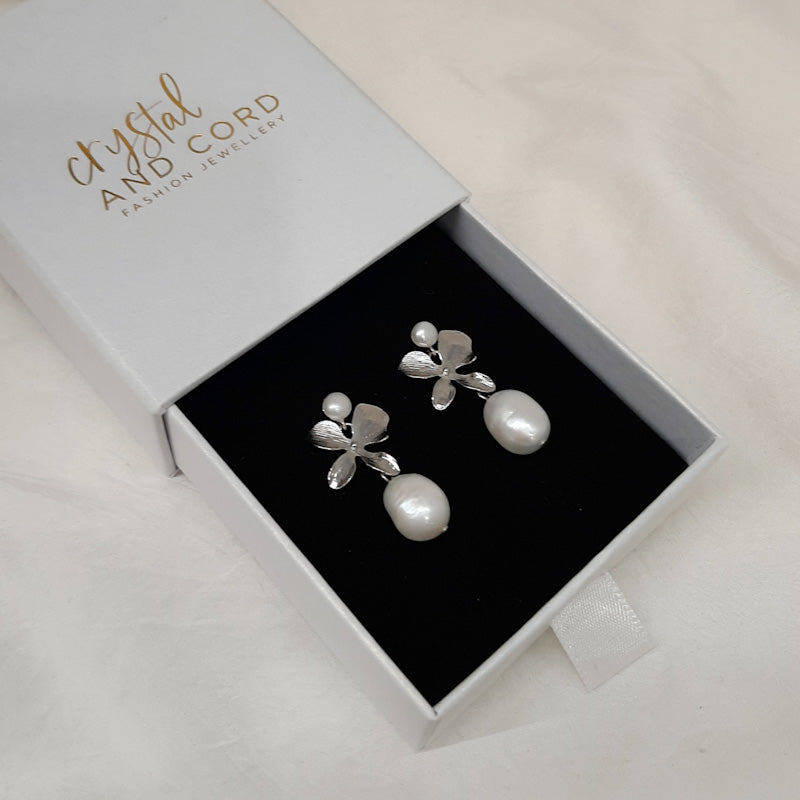Matti - silver or gold orchid shaped flower with freshwater pearl drop earrings