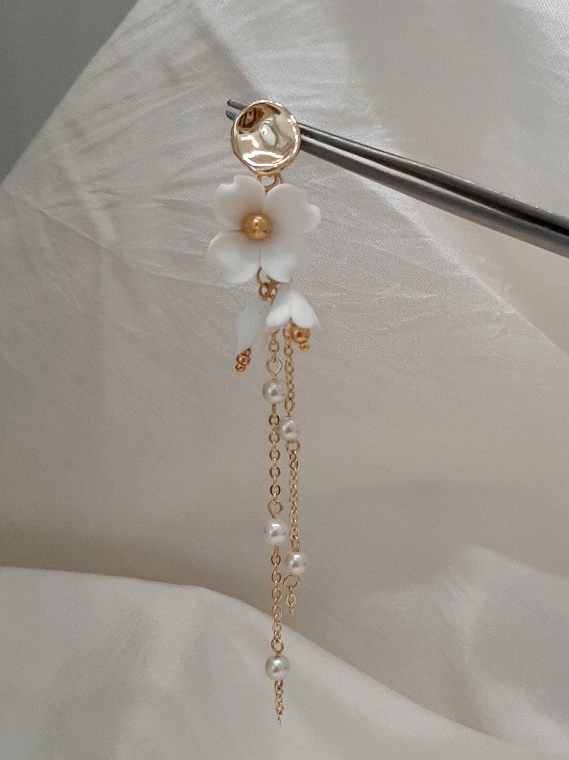 These earrings have been created with beautiful hand made polymer clay flowers and crystal base pearls, and they cascade and sway gently from the gold-tone earstuds or earwires. The choice is yours.