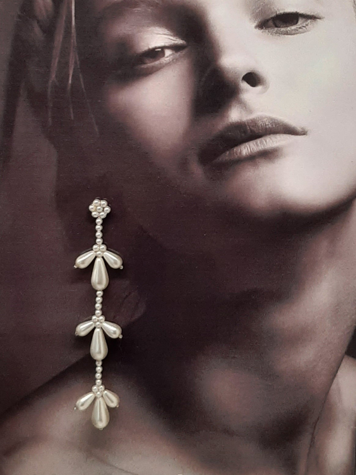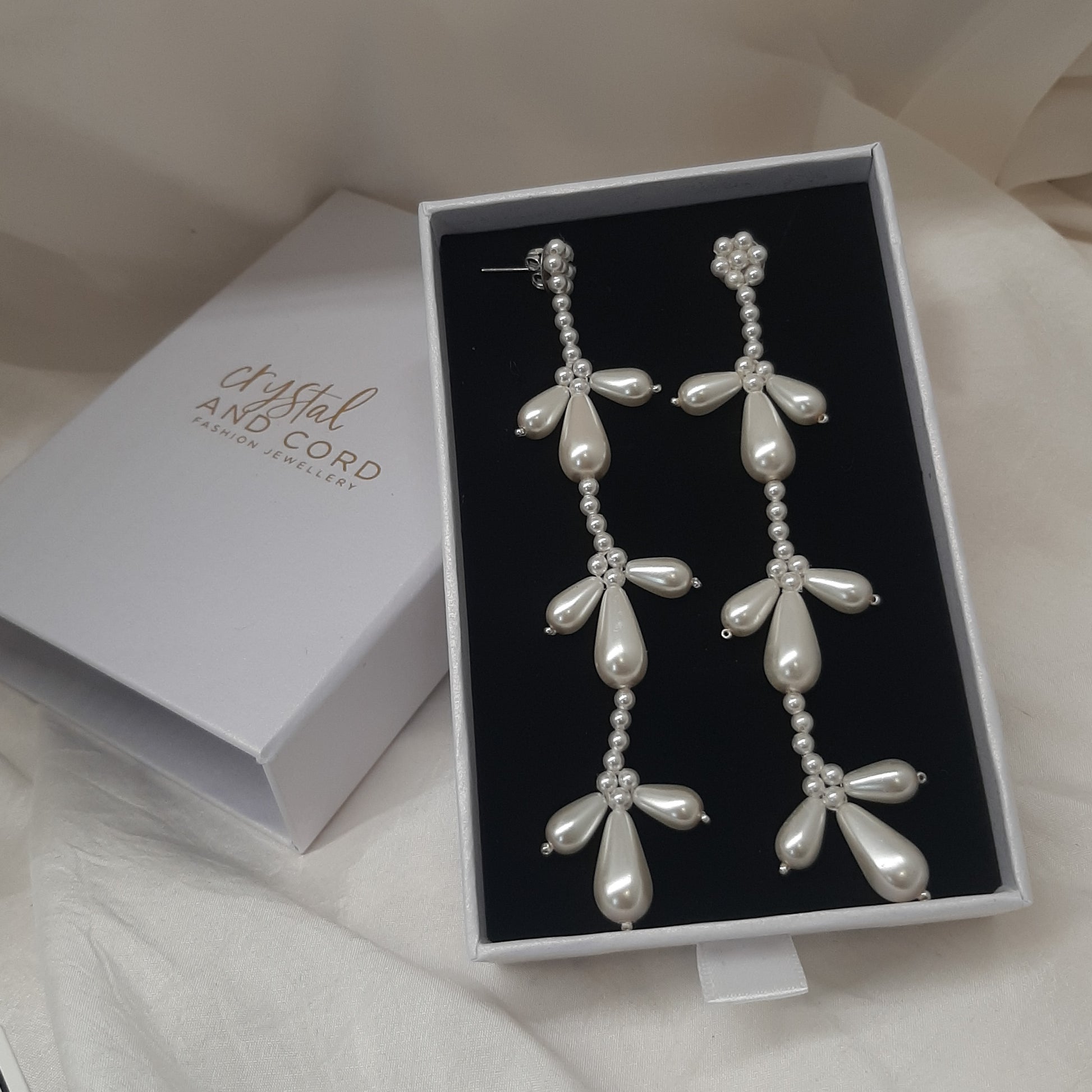 Paige - teardrop crystal pearl beads and sterling silver stud long cascading earrings
