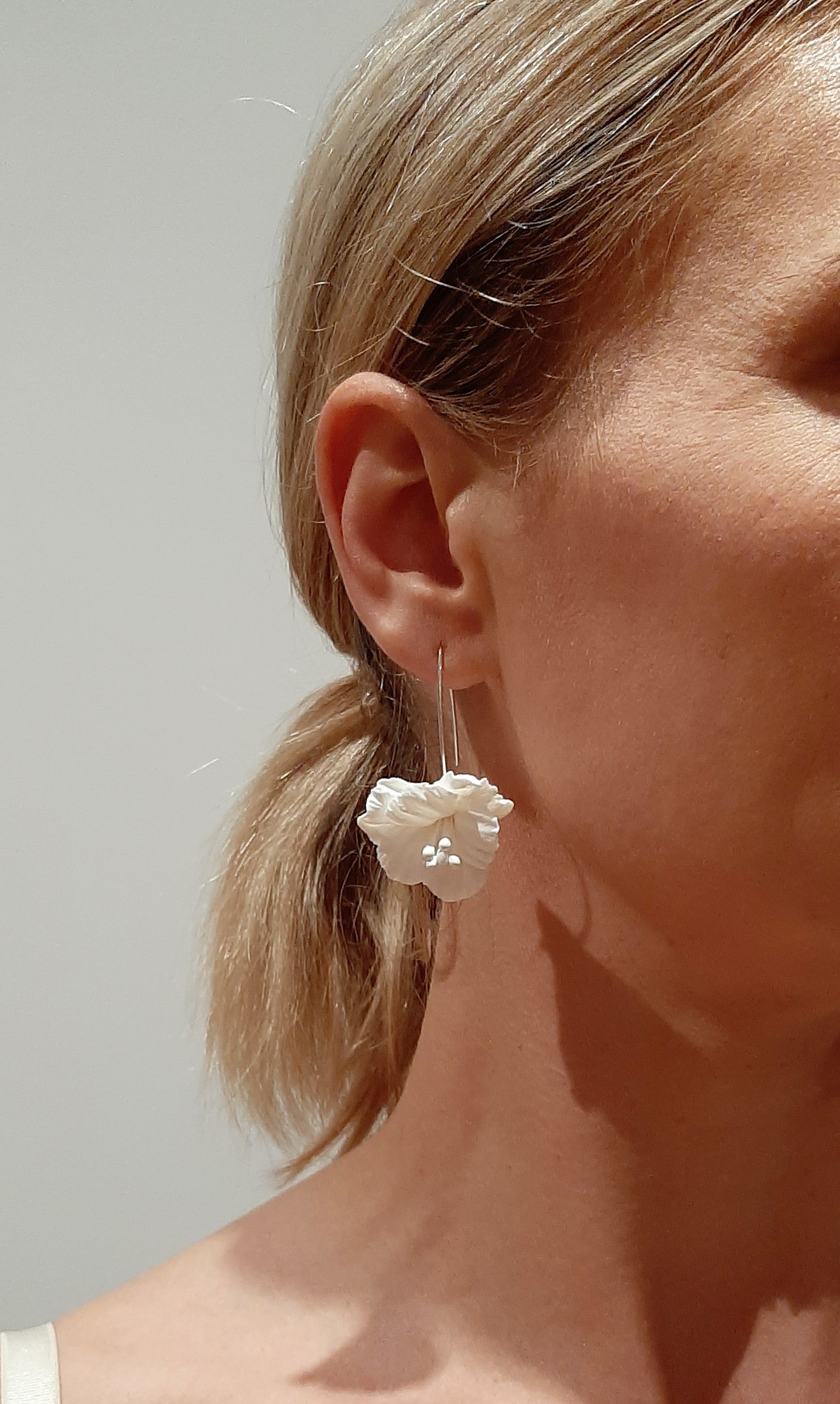 A single white polymer clay flower sways gently from the sterling silver marquise shaped ear wire creating a lite and easy to wear pair of earrings.