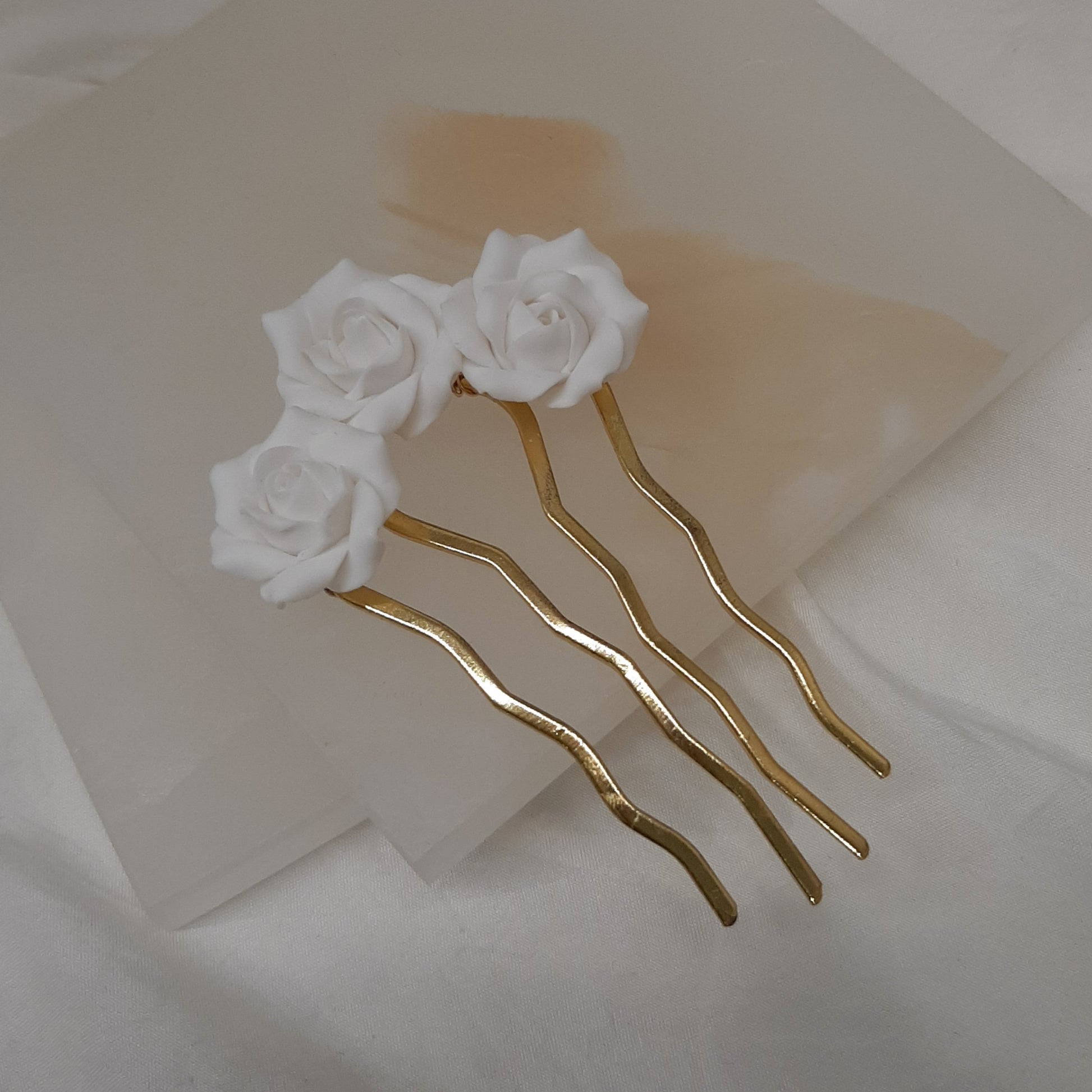 The exquisite ivory roses have been handmade to perfection and the U-shaped hair pin allows them to be securely held in place. They make a stunning choice for brides in search of elegance and charm for their special day.