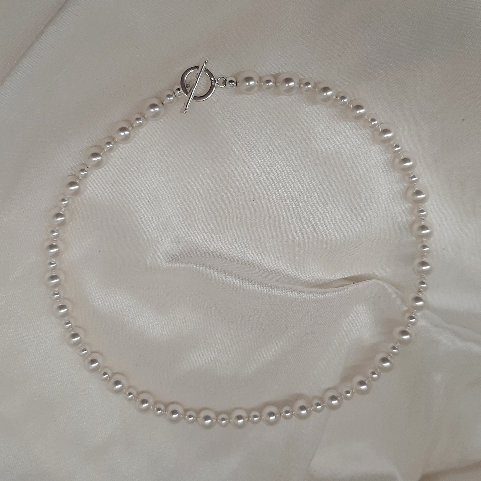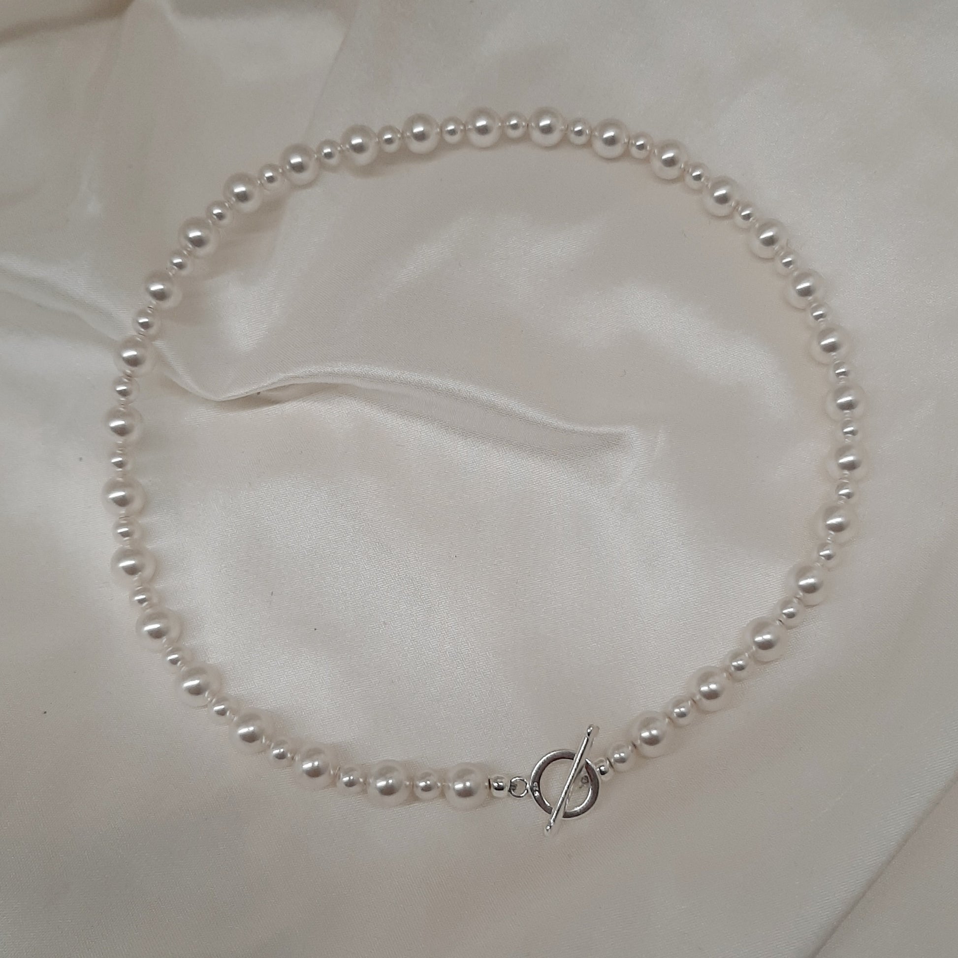 Smooth and silky these white crystal pearls feature a creamy alabaster hue and look magnificant strung with alternating size beads. This necklace has been secured with a sterling silver toggle clasp for ease of use.
