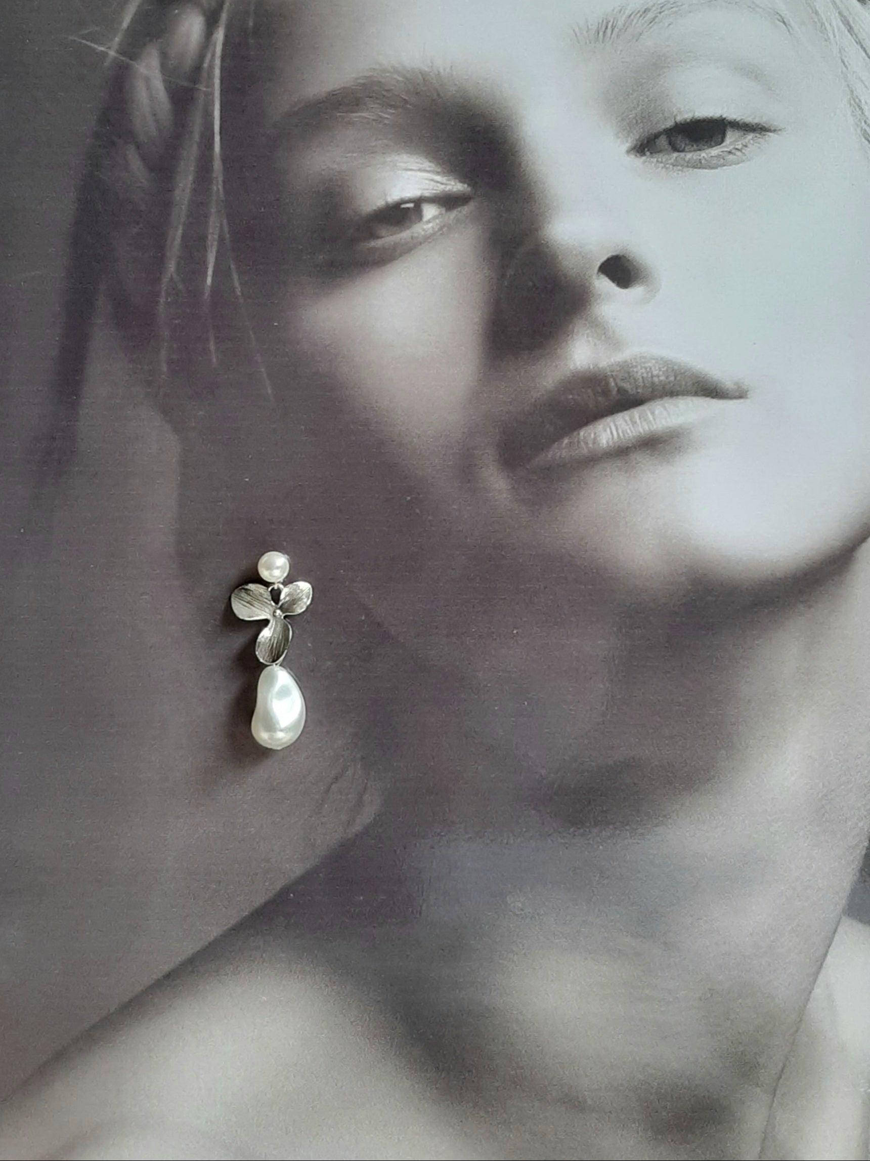 The orchid shaped shiny silver-tone flower/s dangle beautifully from the Swarovski crystal pearl stud, and are finished off nicely with a baroque Swarovski crystal pearl drop.