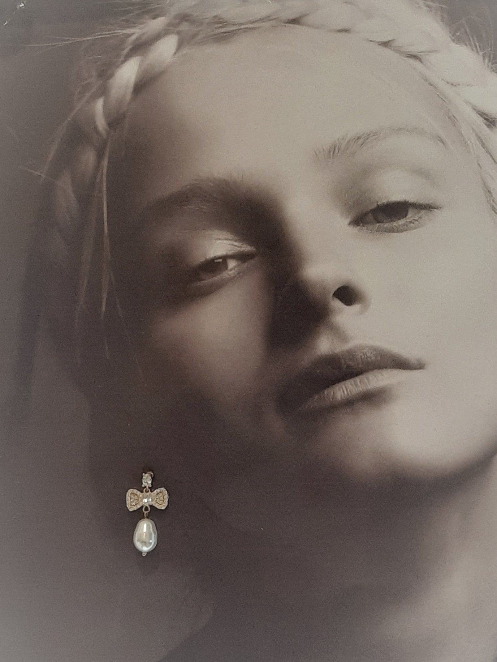 A beautiful silky white Swarovski crystal pear shaped pearl is suspended beautifully from the cubic zirconia bow and ear studs, creating a very elegant and romantic pair of earrings.