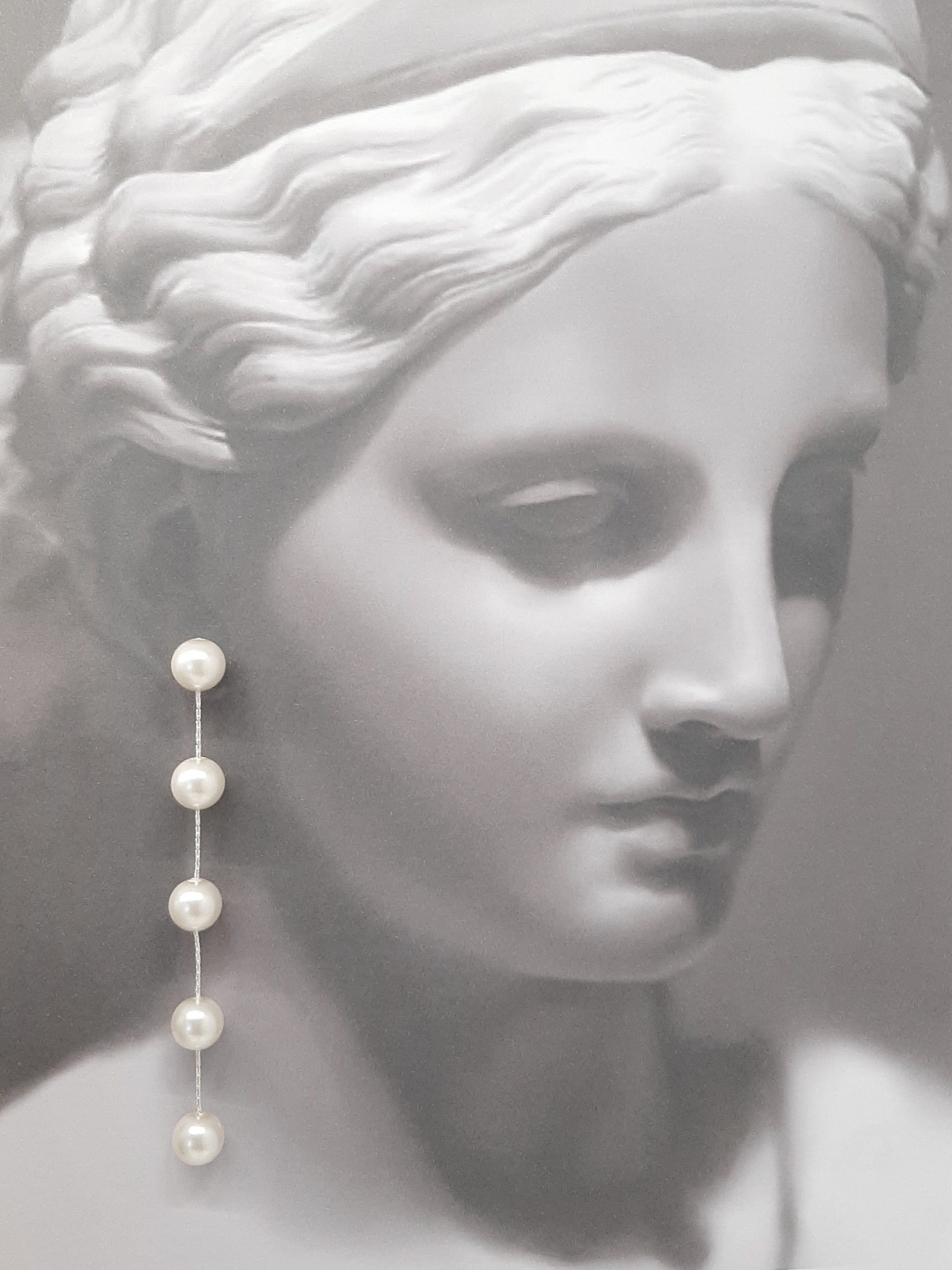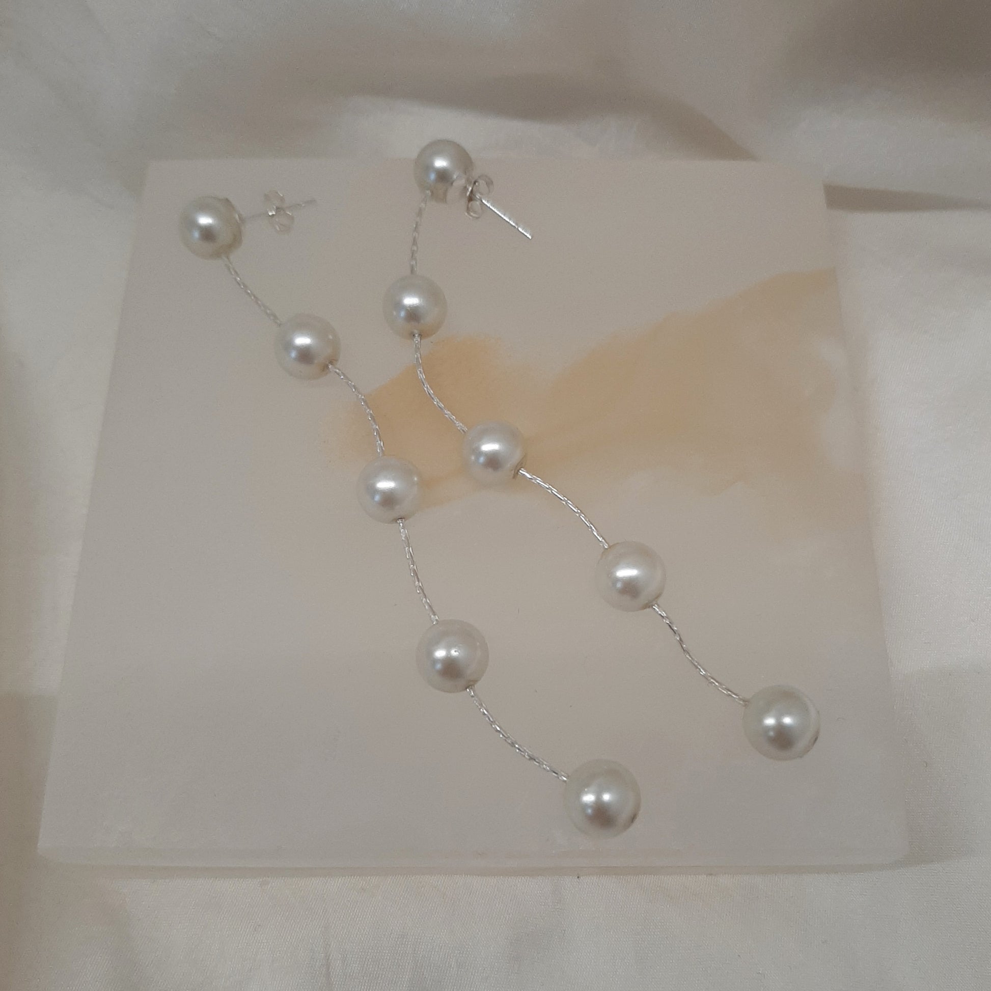 These classic pearls cascade beautifully when threaded through the Boston chain and suspended from the sterling silver or gold plated ear studs. A modern pair of earrings made to be worn with style and grace.