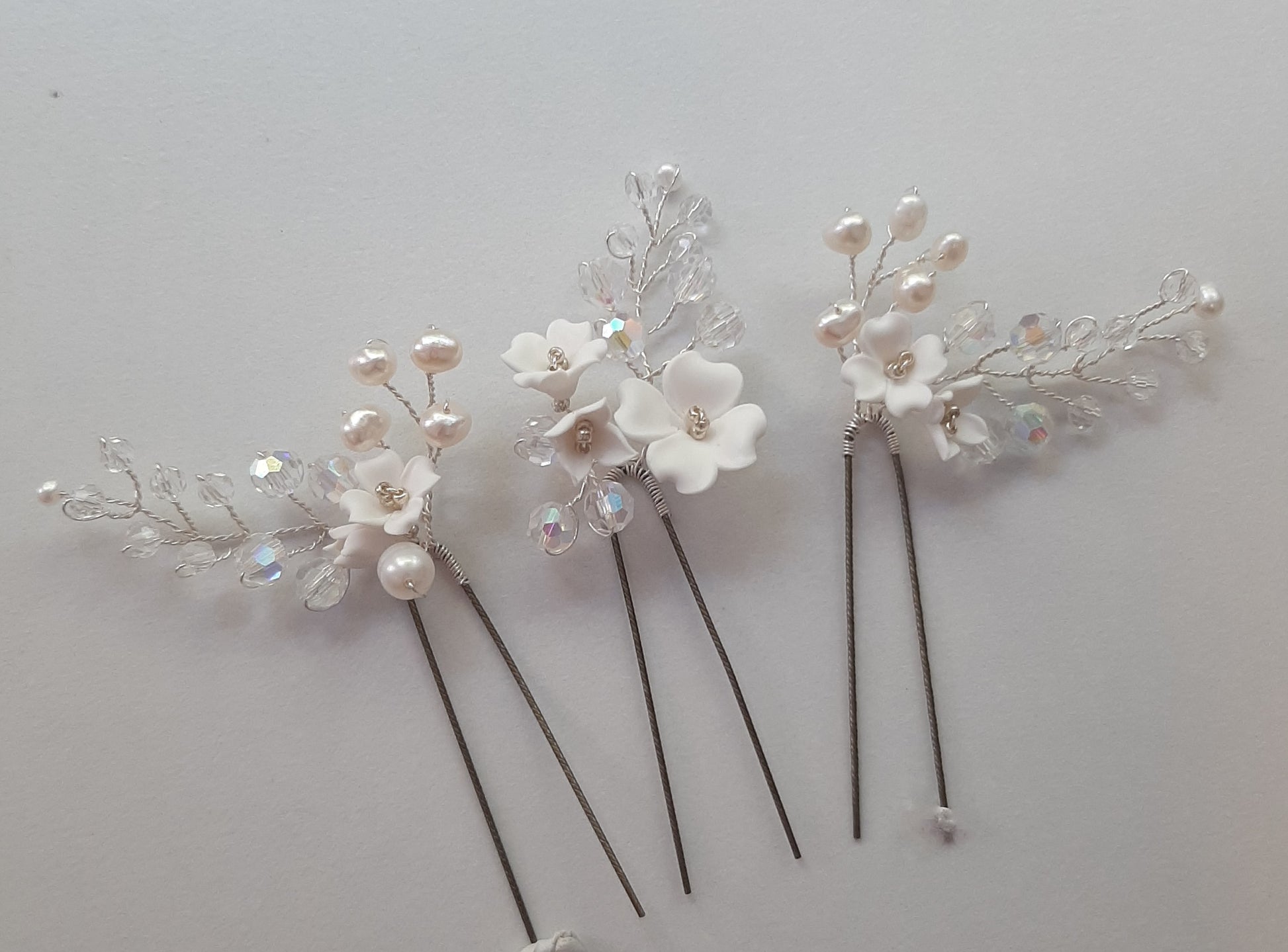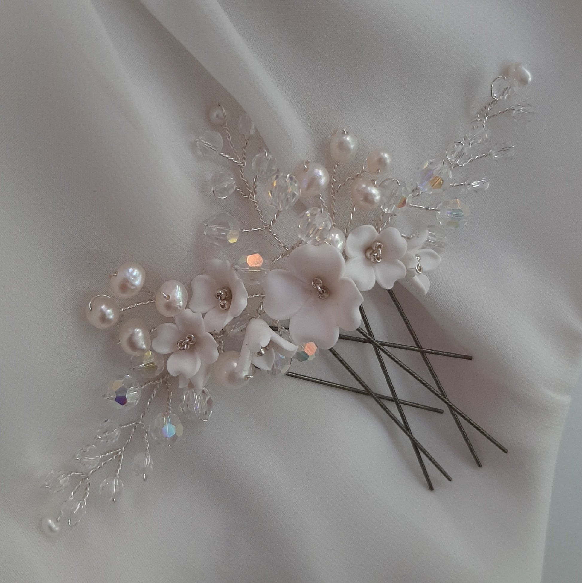 Beautiful hand made polymer clay flowers, crystal clear faceted beads and natural cultured freshwater pearls make these hair pins elegant, romantic and bespoke.