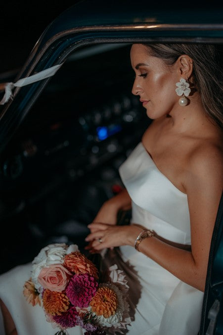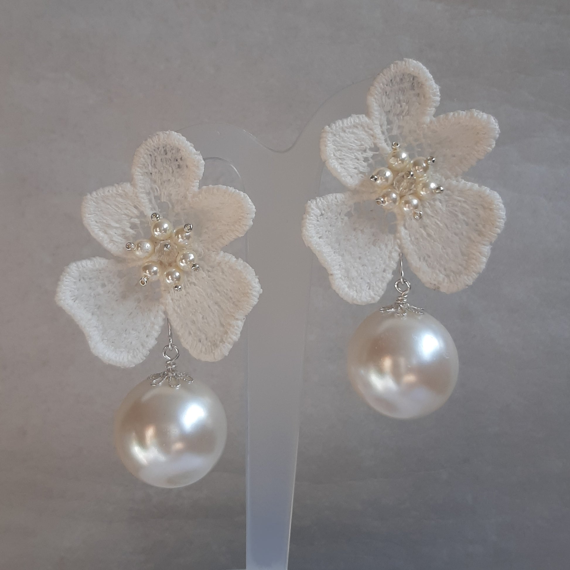 Creamy white lace has been hand cut and coated for durability to make these exquisite flower drop statement earrings. The center of the lace flowers have been embellished with white Preciosa crystal pearl beads, with a champagne or clear coloured crystal bead center. The large drop is an acrylic pearl bead which makes them lightweight to wear.